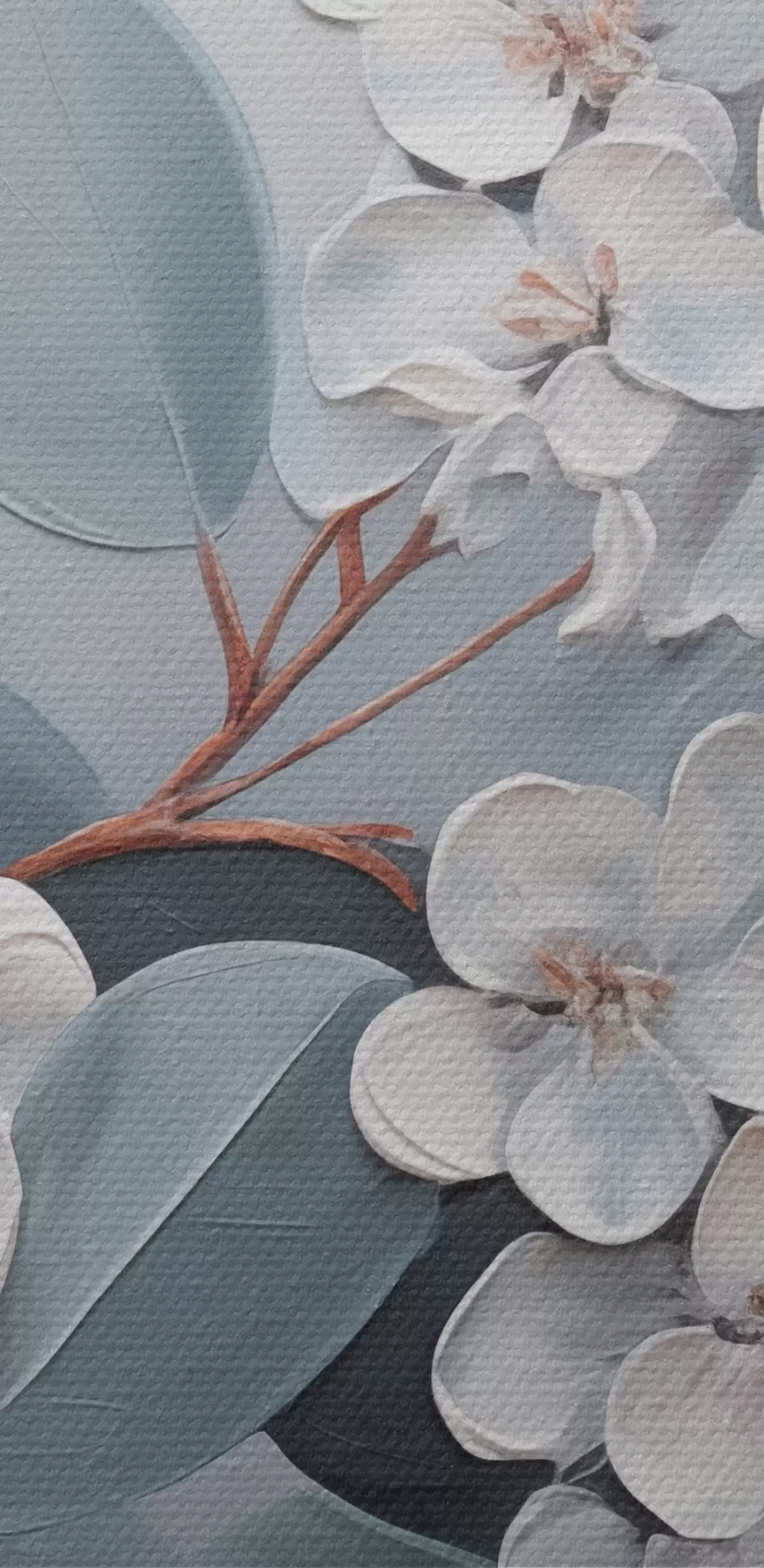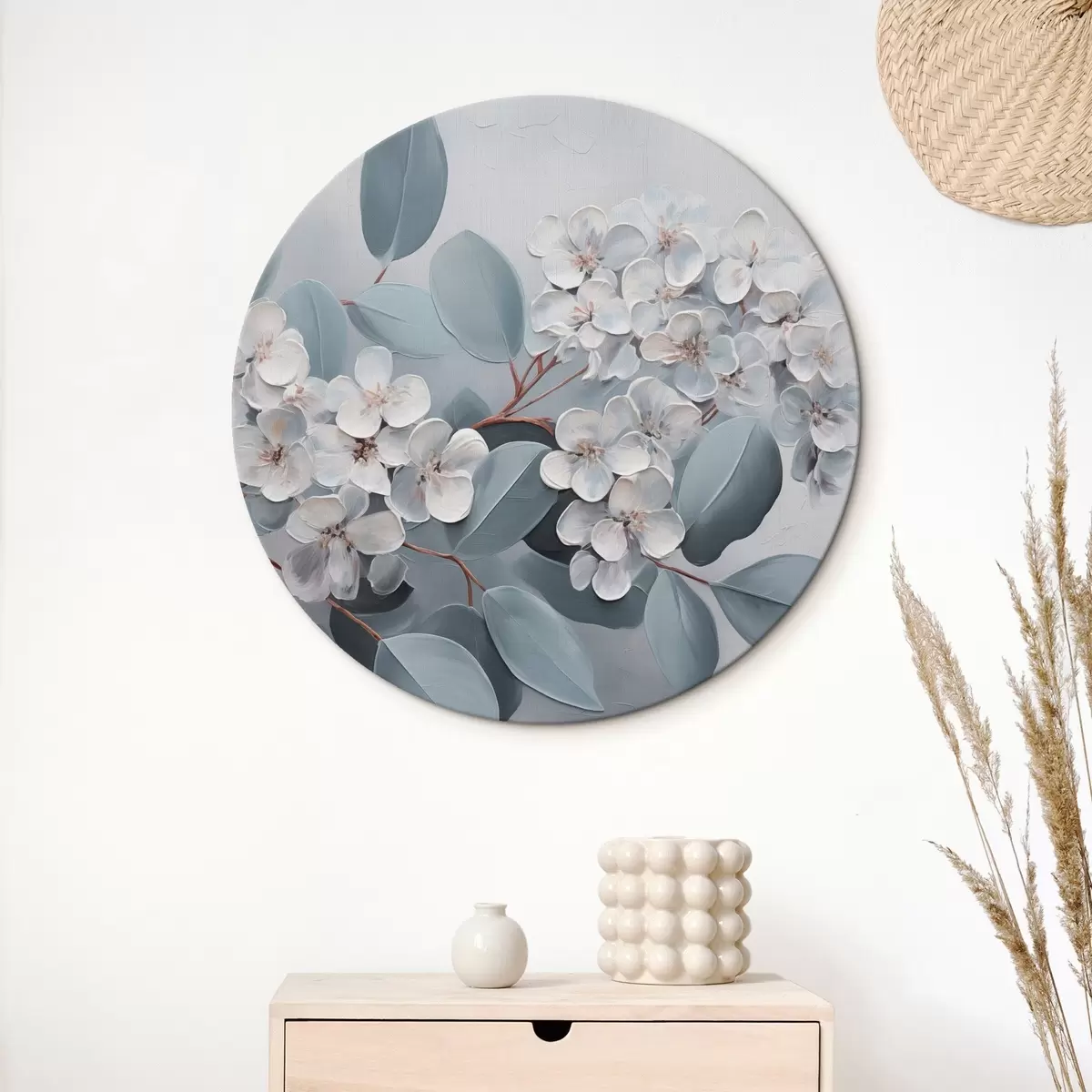 Tableaux rondes Une branche d'hortensia blanc en pleine floraison, avec des feuilles bleues sur un fond gris clair, style peinture à l'huile Nr r43391
