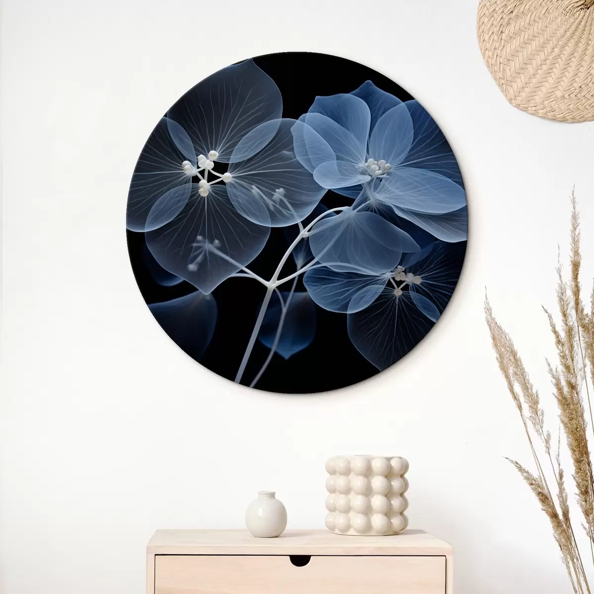 Tableaux rondes Une fleur d'hortensia bleu translucide avec des étamines bleues et une tige délicate, sur un fond noir Nr r43395