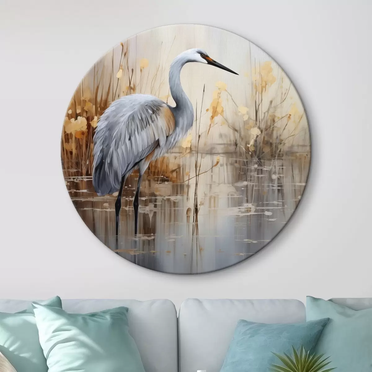 Tableaux rondes Un héron gris se tenant dans un étang, entouré de plantes hautes et fines, l'arrière-plan est un doux mélange de beige et de blanc Nr r43398