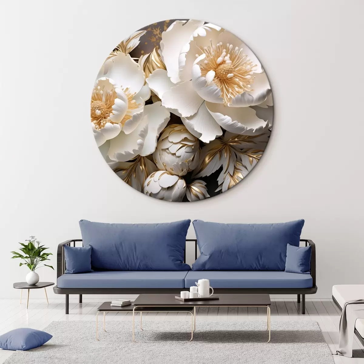 Tableaux rondes Pivoines blanches et jaunes avec feuilles, détails complexes, art décoratif, fond sombre Nr r43399