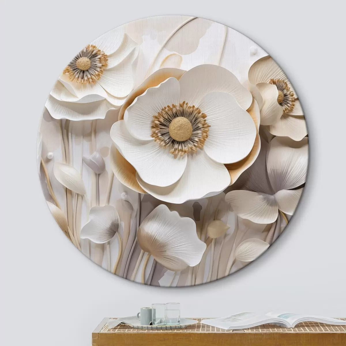 Tableaux rondes Fleurs d'anémones blanches à centre jaune, sur fond minimaliste, créant un motif floral délicat Nr r43400