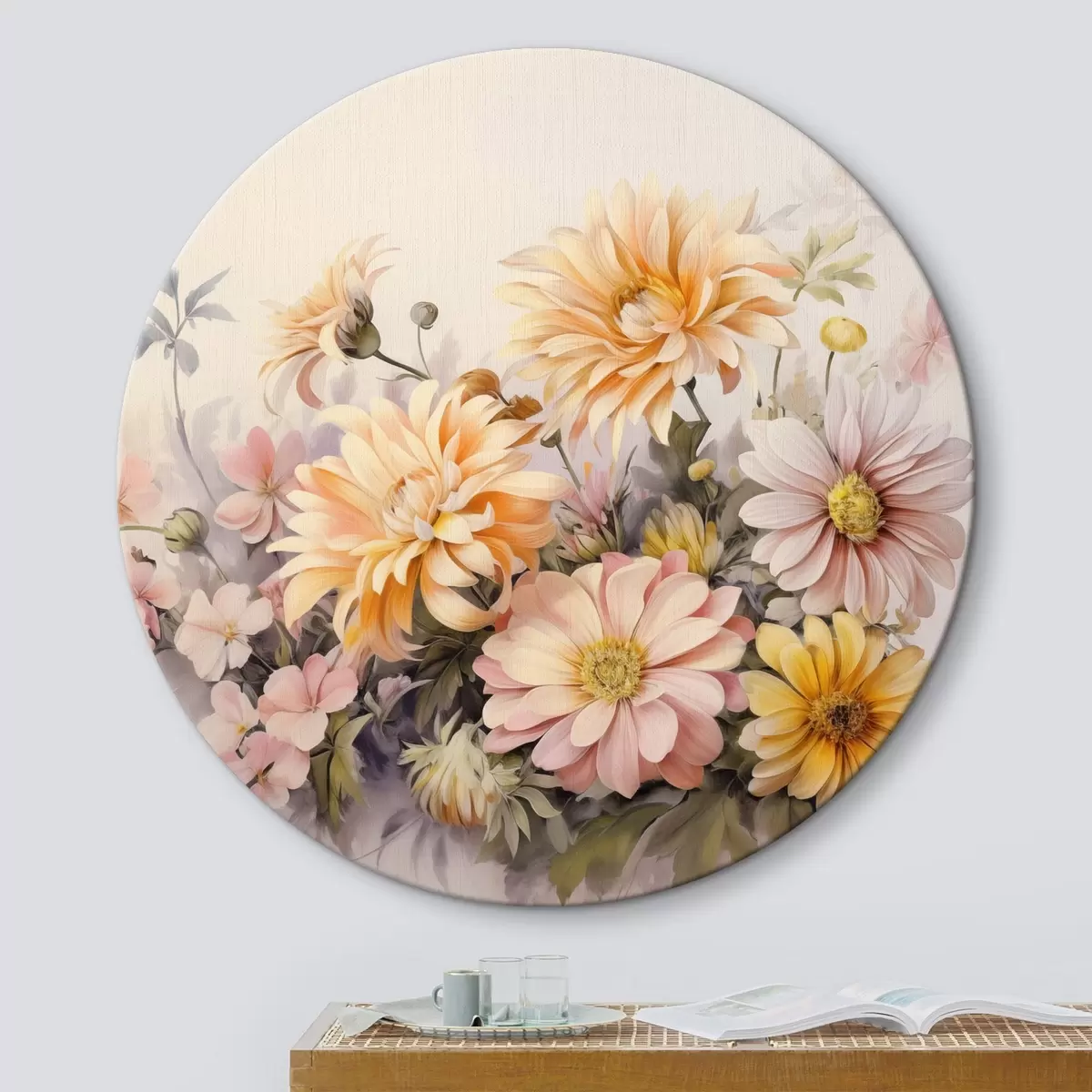 Tableaux rondes Collection de fleurs roses, jaunes et orange, fond clair, couleurs douces, style vintage, illustration botanique Nr r43401