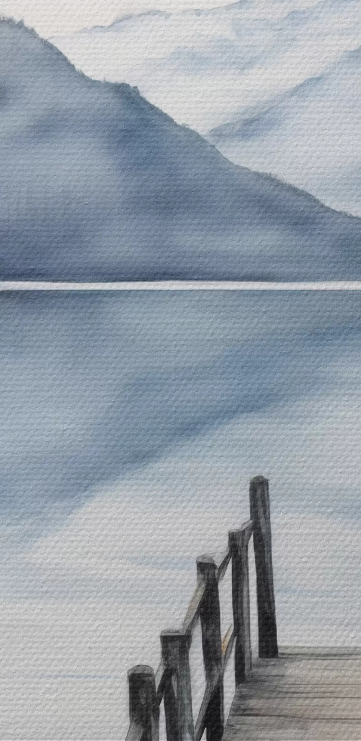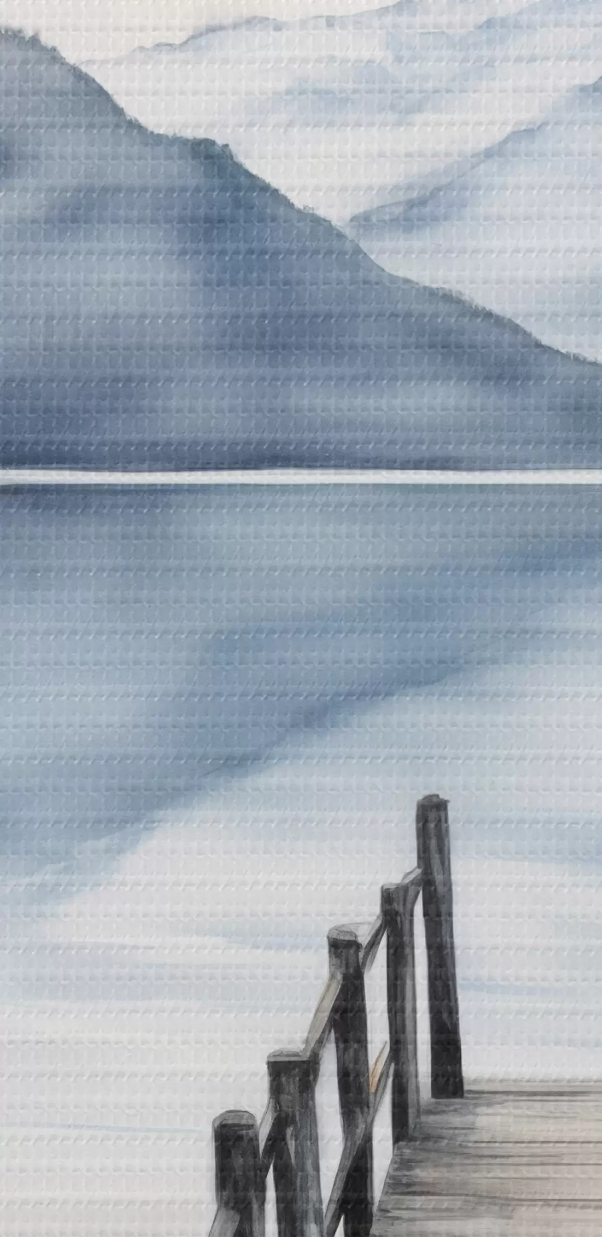 Tableaux rondes Un quai en bois s'étend sur un lac calme, entouré de montagnes et d'arbres à feuilles persistantes, style aquarelle Nr r43405