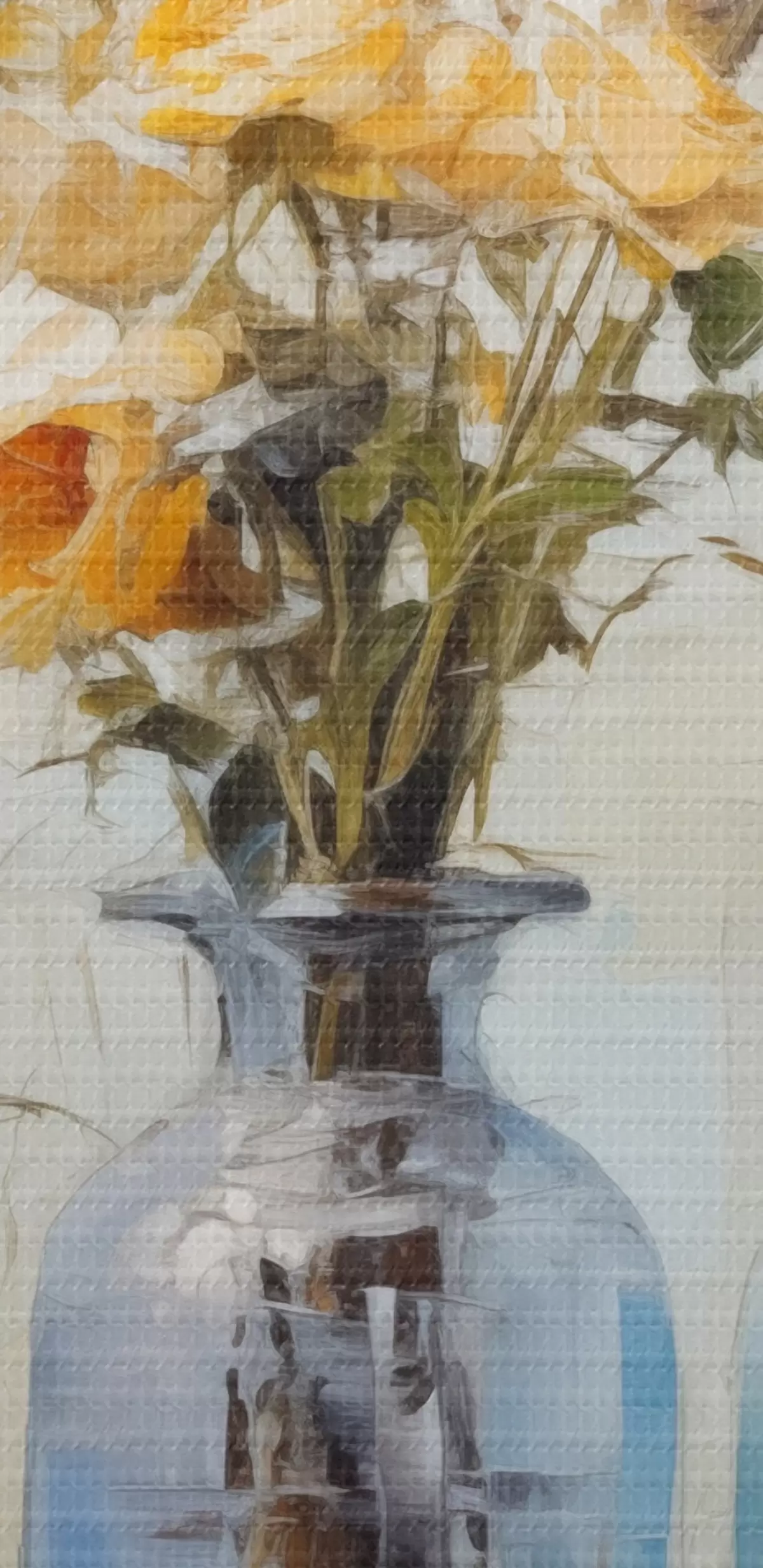 Tableaux rondes Nature morte de roses jaunes dans des vases en verre bleu, fond légèrement texturé, coups de pinceau doux, style peinture à l'huile r43409