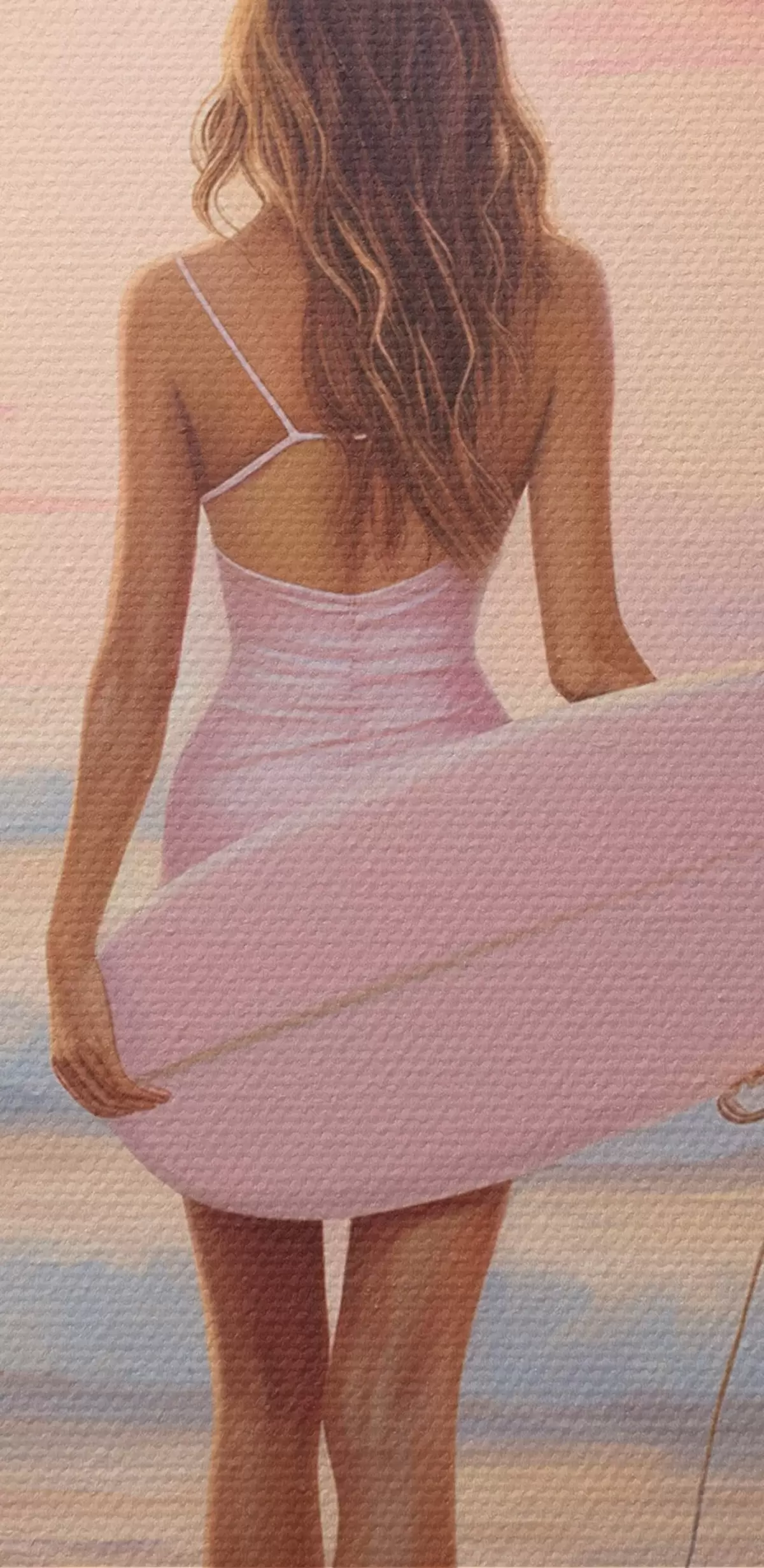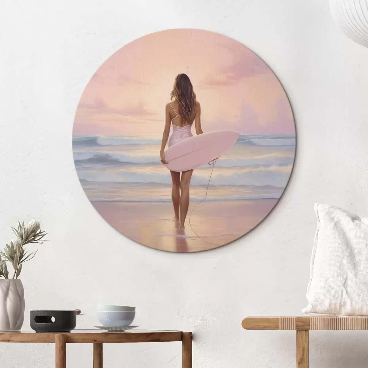 Tableaux rondes Fille avec planche de surf sur la plage de l'océan, coucher de soleil, dessin à l'acrylique Nr r43881
