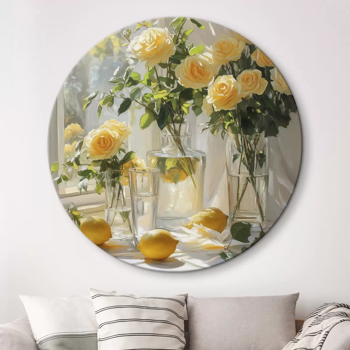 Tableaux rondes Roses dans des vases, dessin à l'huile, lumière douce du soleil, citrons, printemps Nr r43887