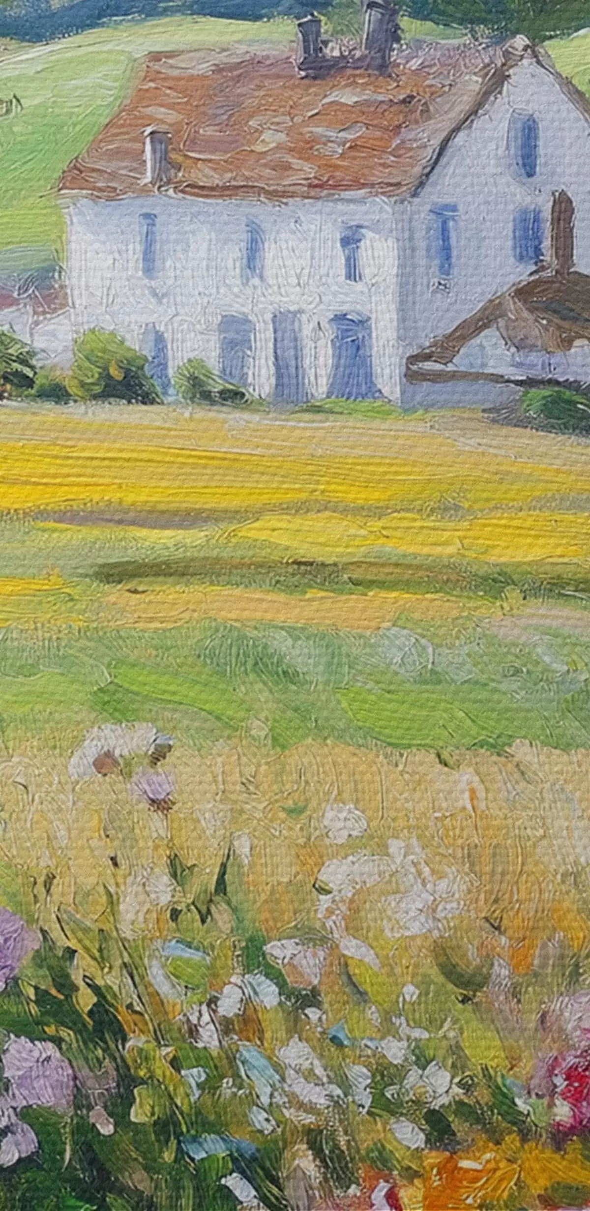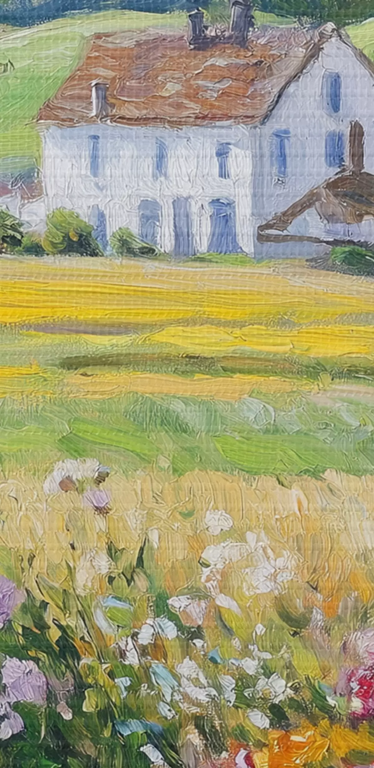 Tableaux rondes Paysages de village dans la fenêtre en bois, fleurs, champs, style huile, maison de ferme r43888