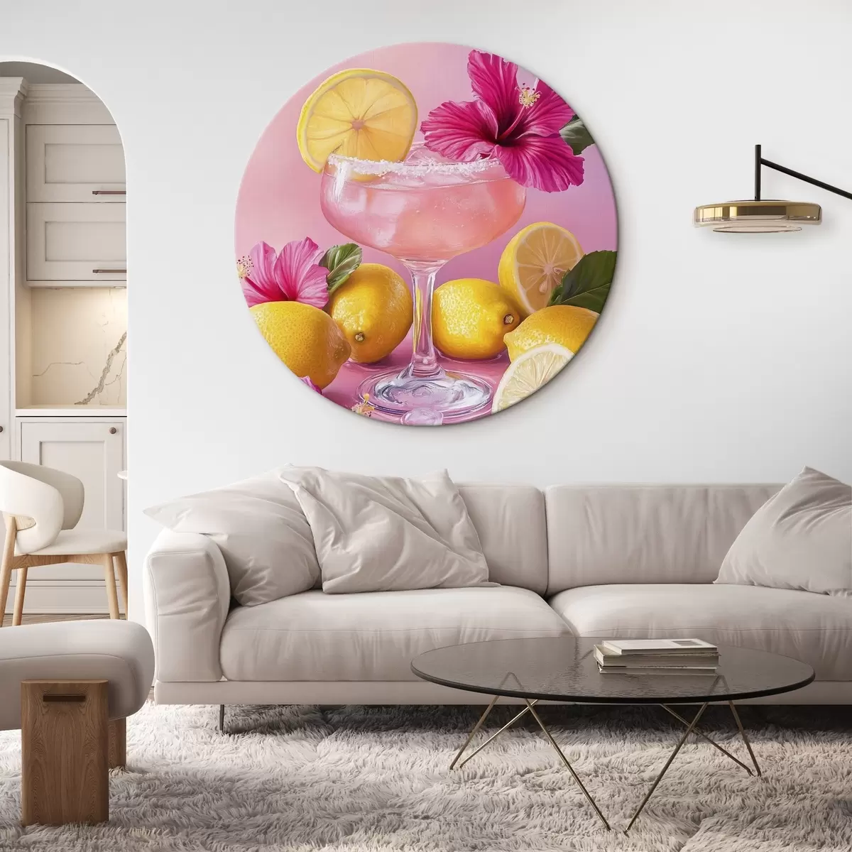 Tableaux rondes Cocktail d'été avec fleurs et citrons, couleurs roses, style aquarelle r43895
