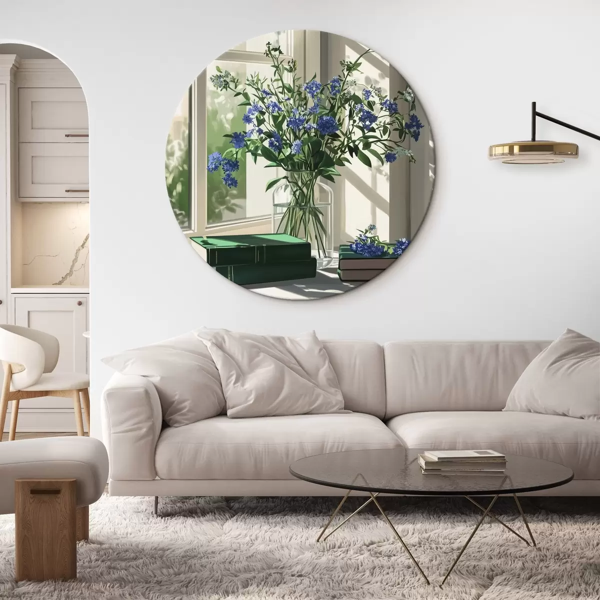 Tableaux rondes Livres et fleurs violettes dans le vase sur le rebord de la fenêtre, verdure Nr r44008