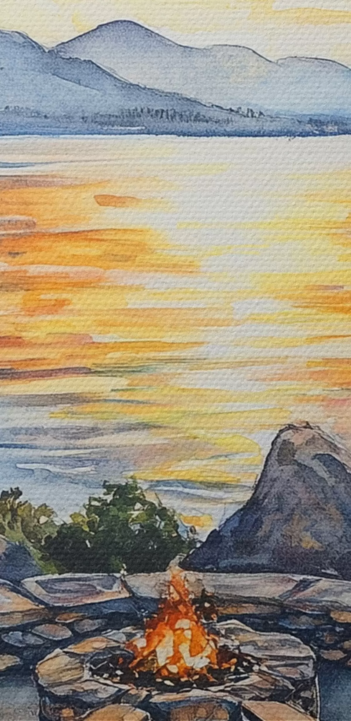 Tableaux rondes Lac avec montagnes au coucher du soleil, voyage, cheminée confortable, aquarelle r44018