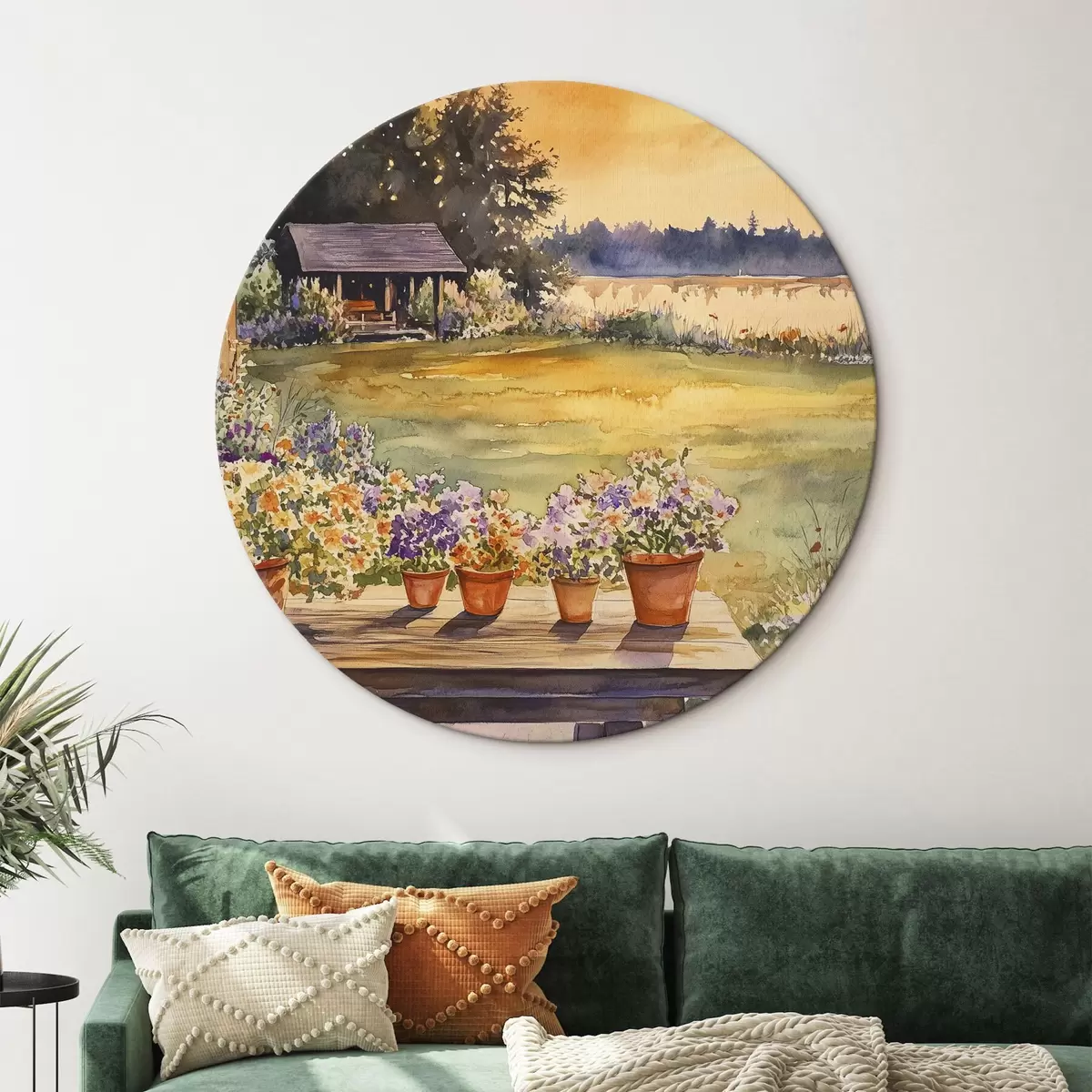 Tableaux rondes Fleurs dans le jardin du village, couleurs du coucher de soleil, style aquarelle Nr r44019