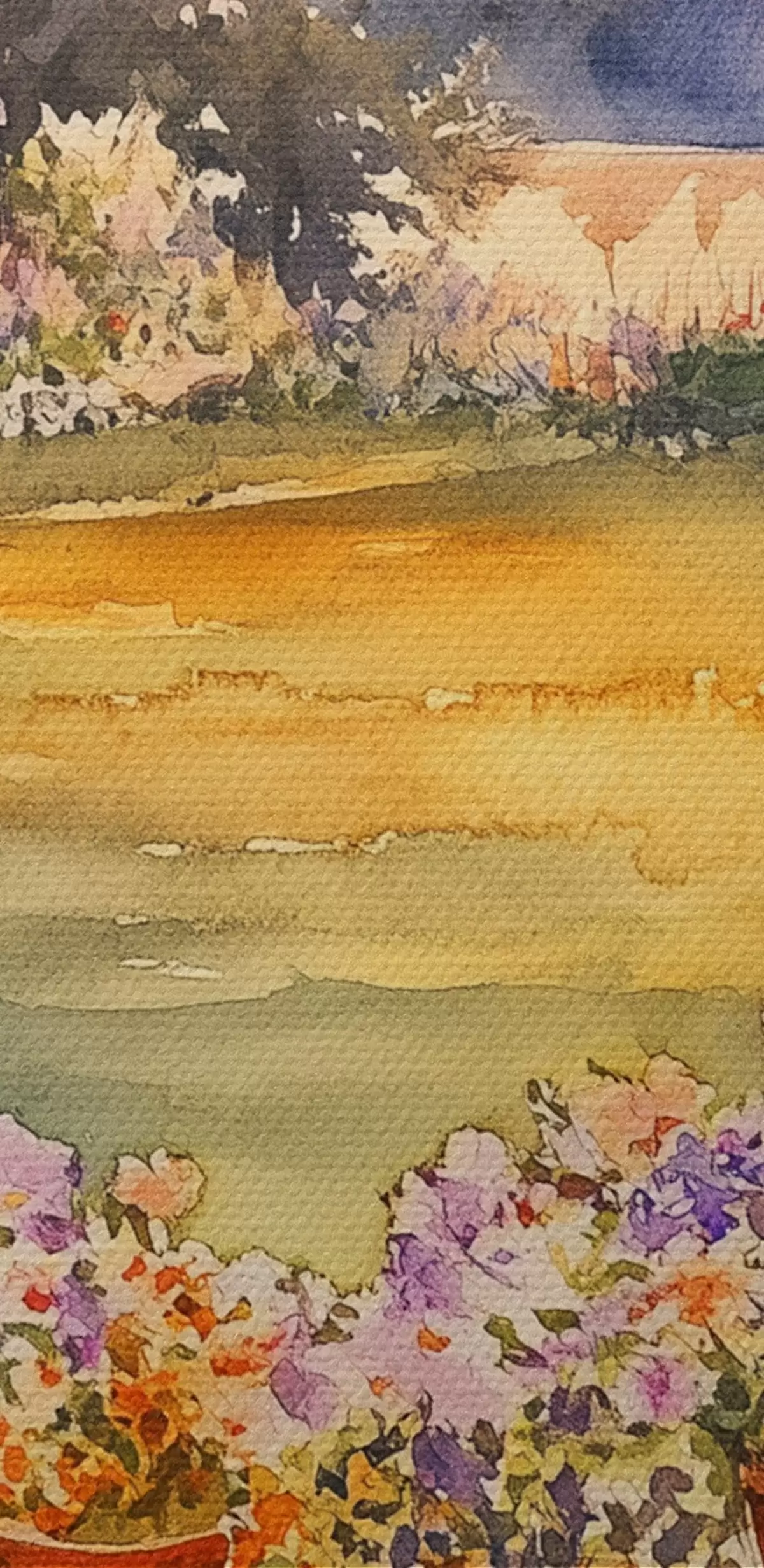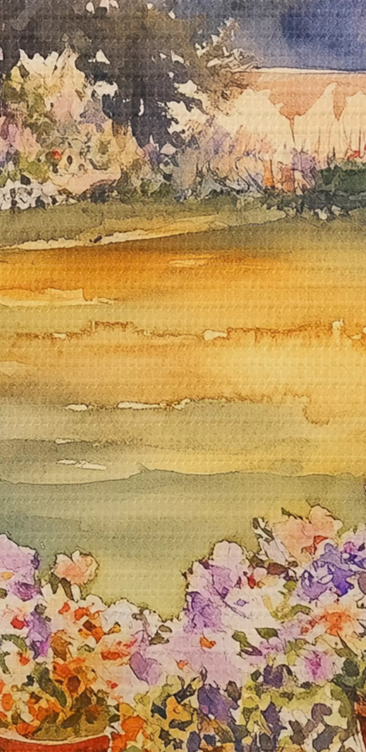 Tableaux rondes Fleurs dans le jardin du village, couleurs du coucher de soleil, style aquarelle r44019