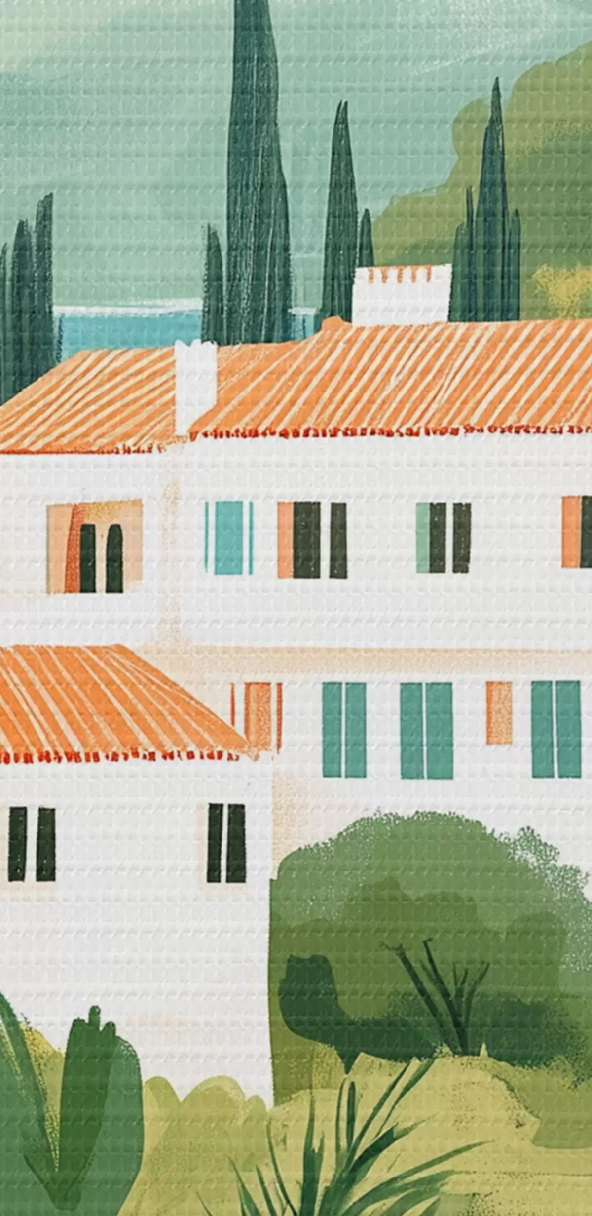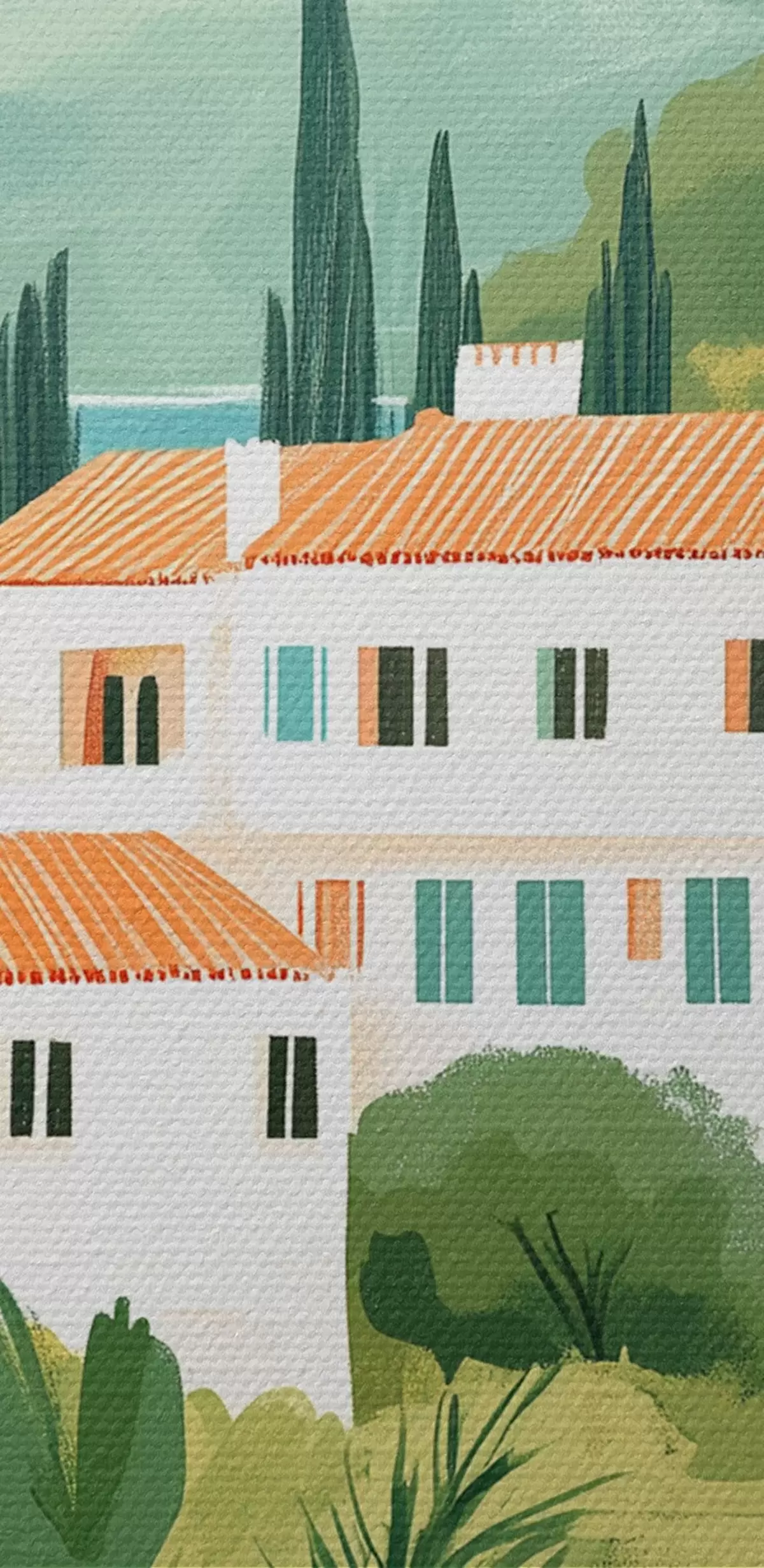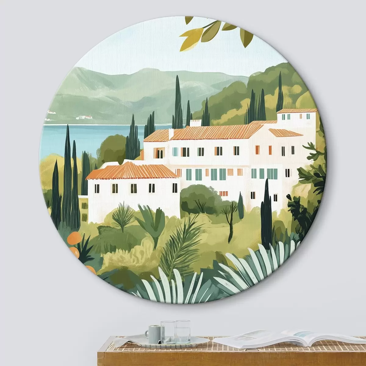 Tableaux rondes Paysages méditerranéens avec orangers et maisons, côte maritime r44027