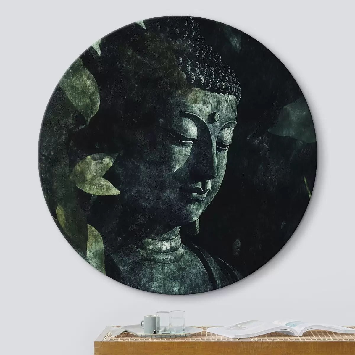 Tableaux rondes Bouddha méditatif dans les feuilles vertes, spirituel Nr r44029