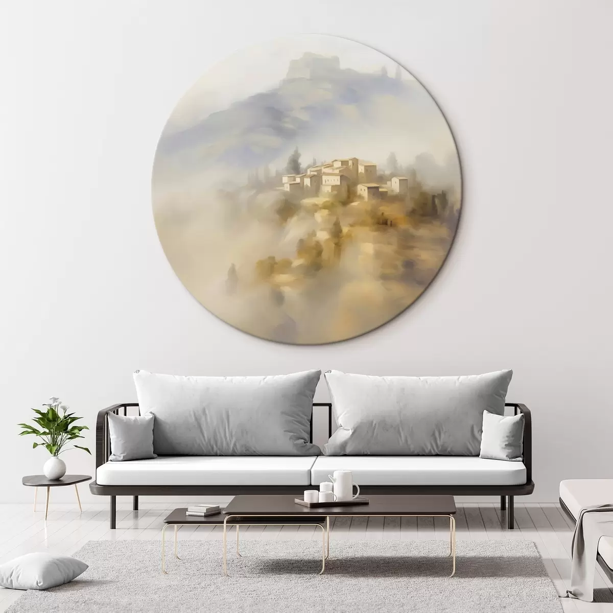 Tableaux rondes Village sur fond de montagnes Nr r44127