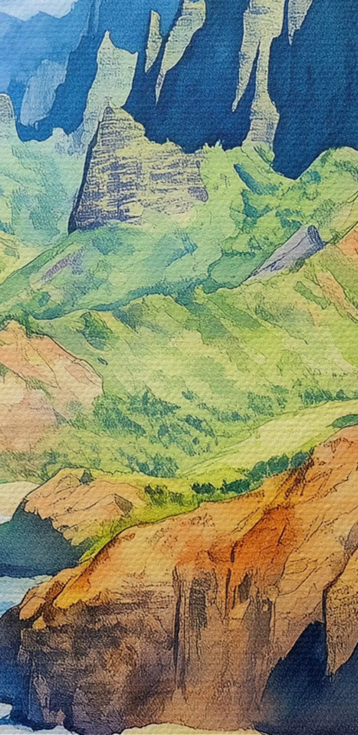 Tableaux rondes Île d'Hawaï, style aquarelle, arc-en-ciel, montagnes vertes, océan Nr r44141