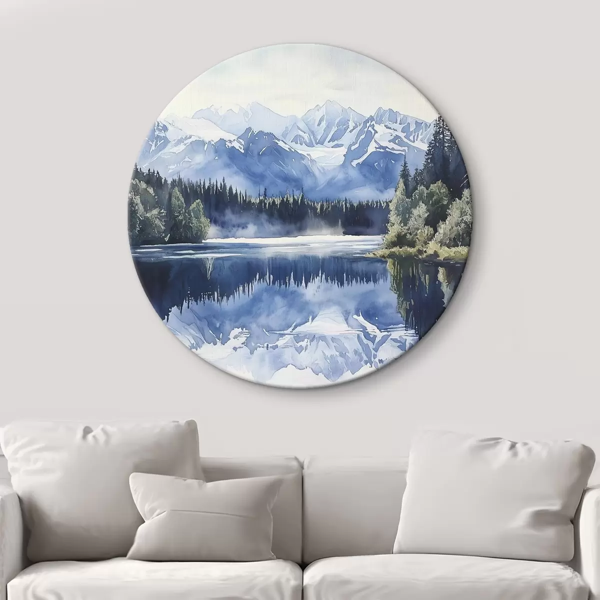 Tableaux rondes Belles montagnes en Nouvelle-Zélande, style aquarelle, lac, forêt r44144