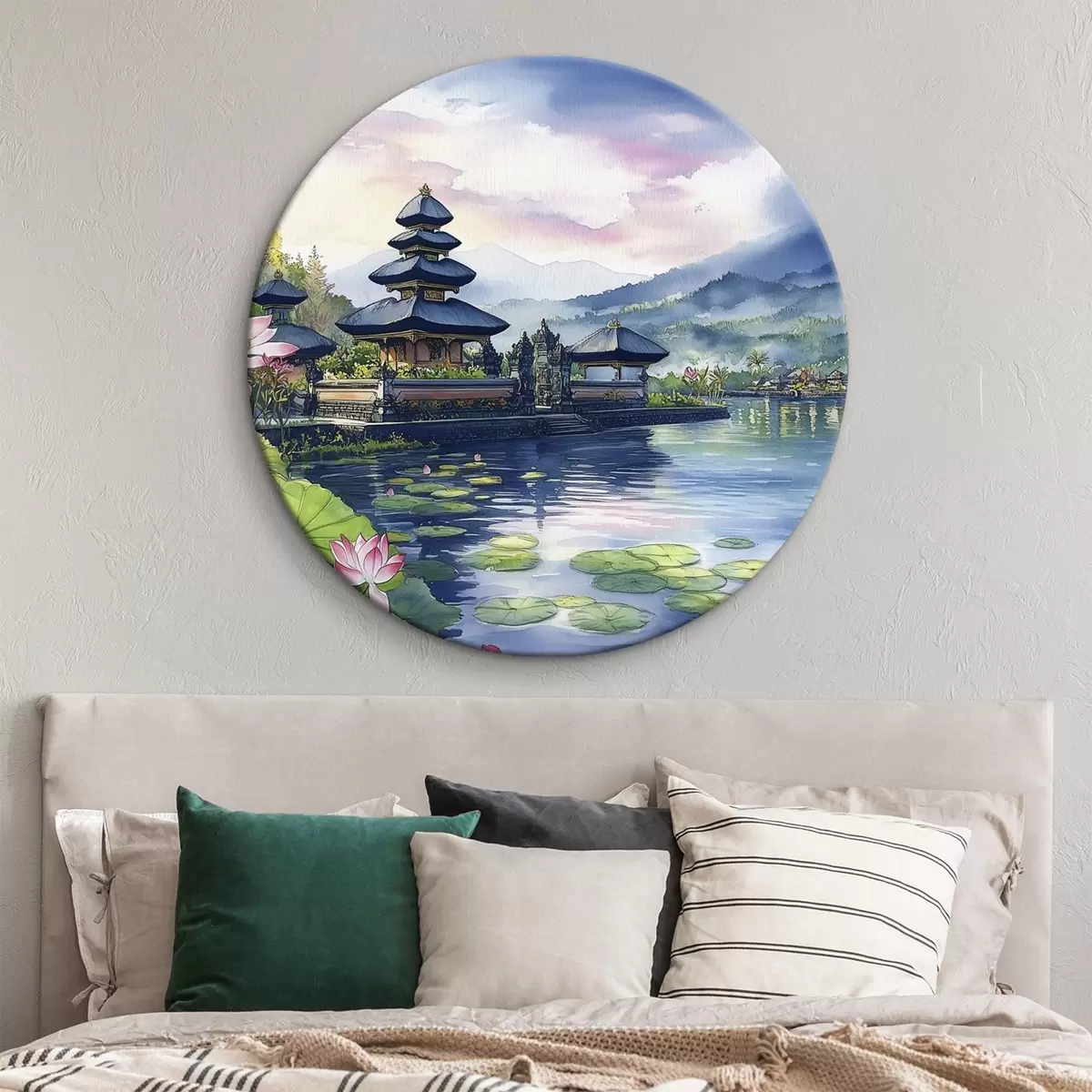Tableaux rondes Île indonésienne, temple, bouddhisme, nature tropicale, style aquarelle Nr r44148