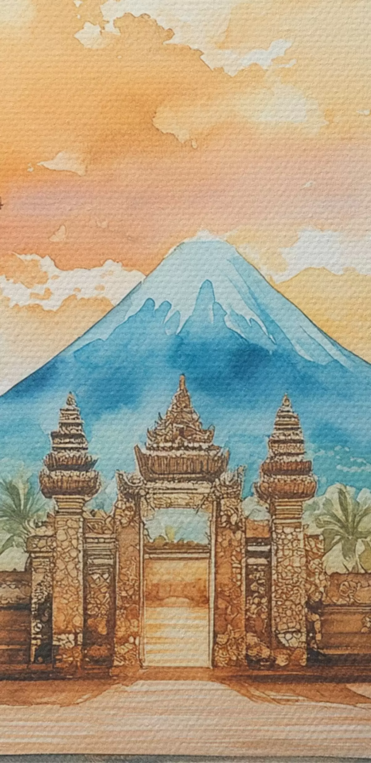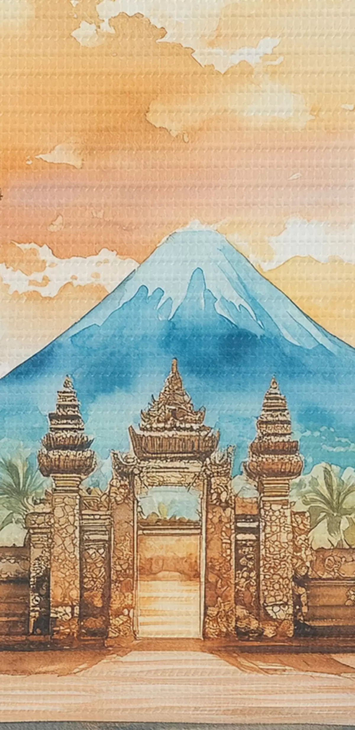 Tableaux rondes Esthétique de Bali, temple, ciel couchant, nature tropicale, style aquarelle Nr r44149