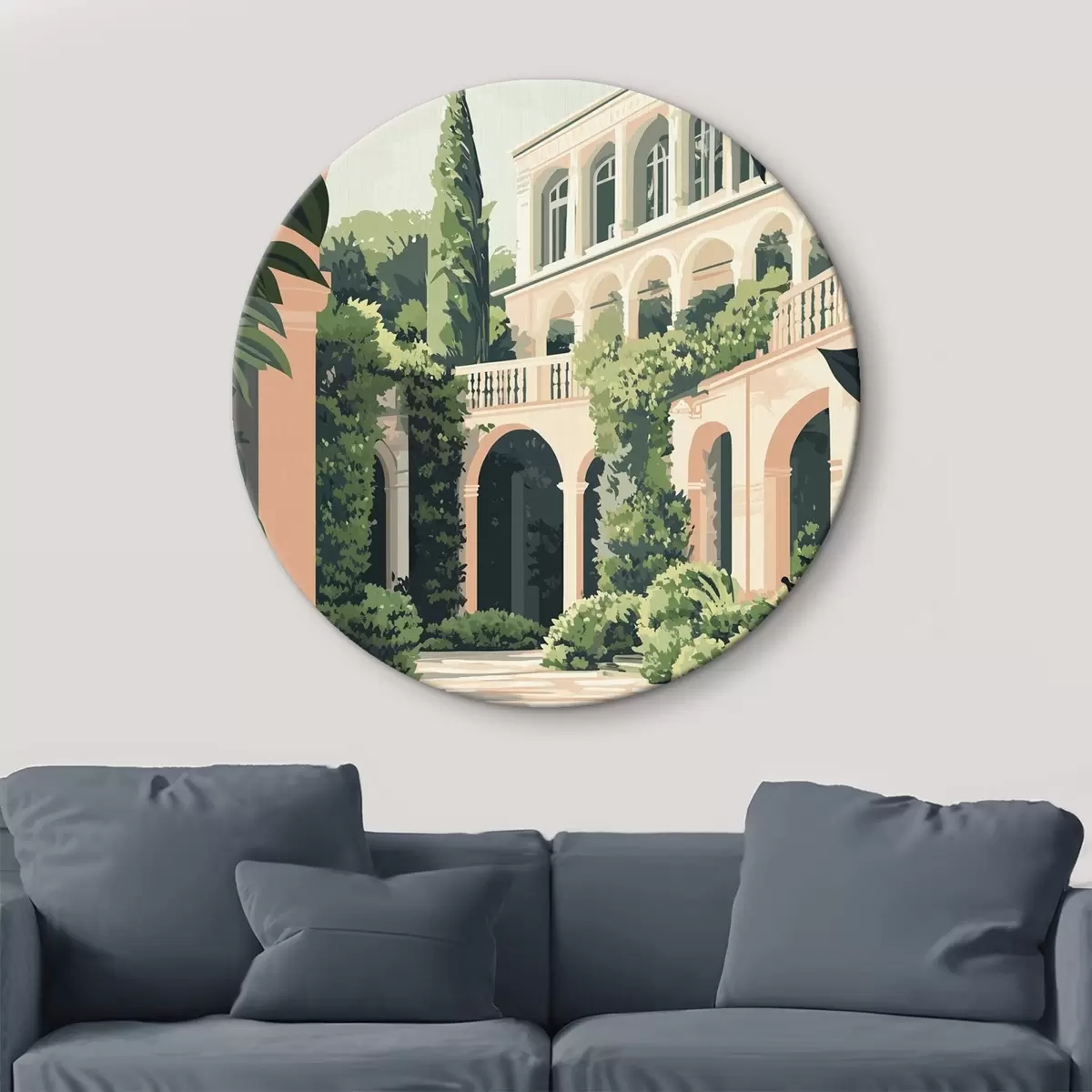 Tableaux rondes Architecture méditerranéenne, nature tropicale, style plat, villa avec jardin Nr r44150