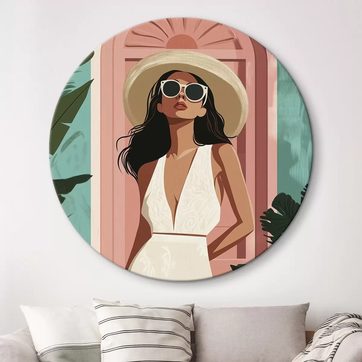 Tableaux rondes Femme avec lunettes de soleil et chapeau, nature tropicale, architecture r44152