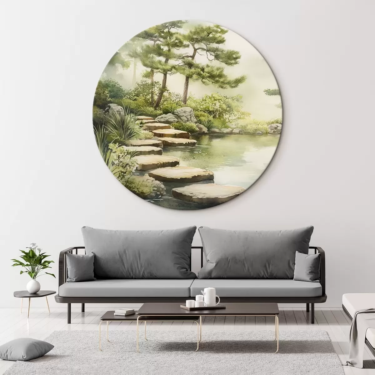 Tableaux rondes Jardin oriental avec lac et arbres, nature, style aquarelle Nr r44313