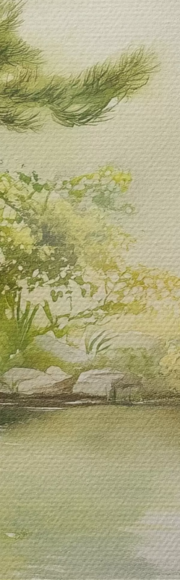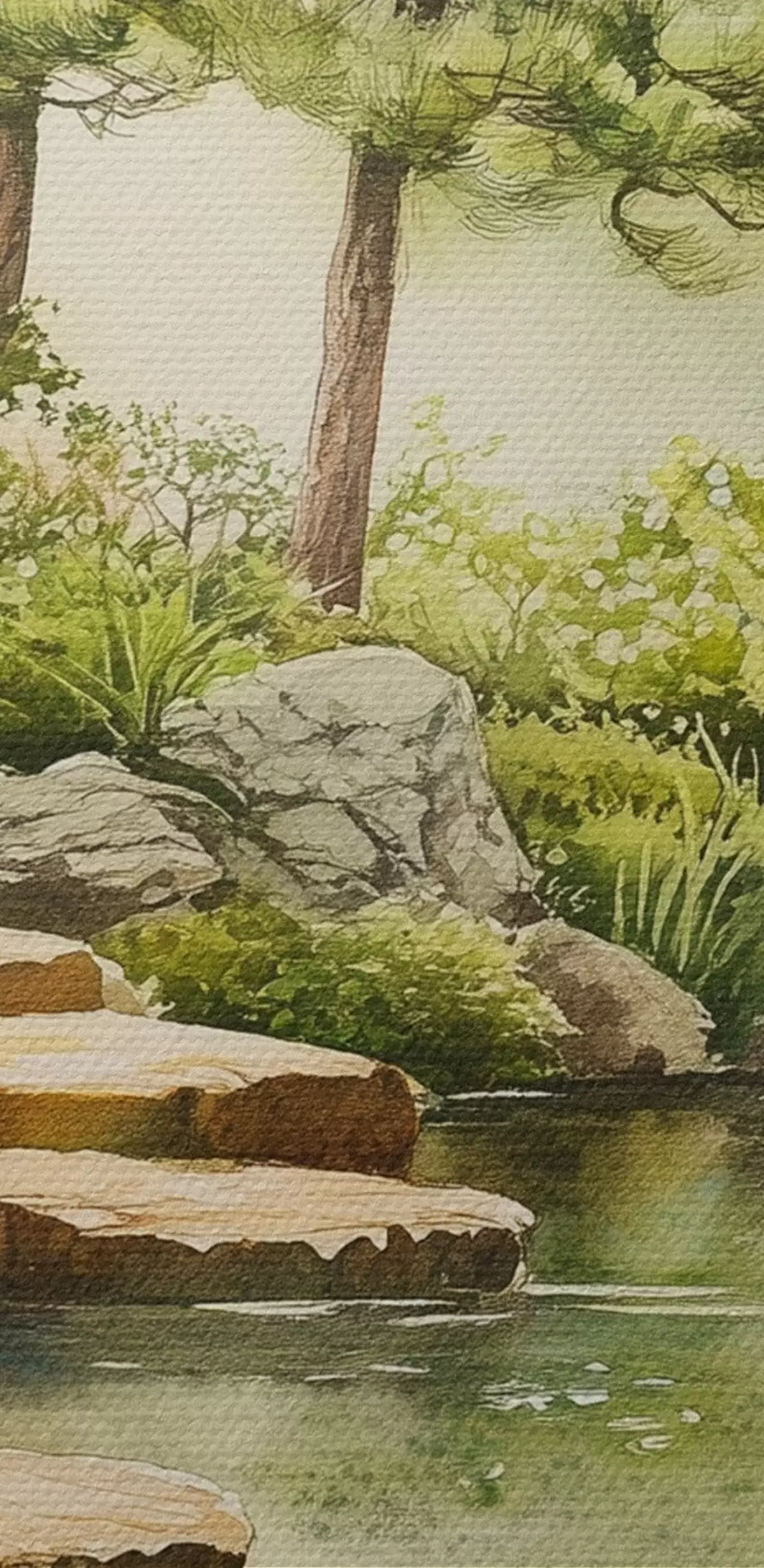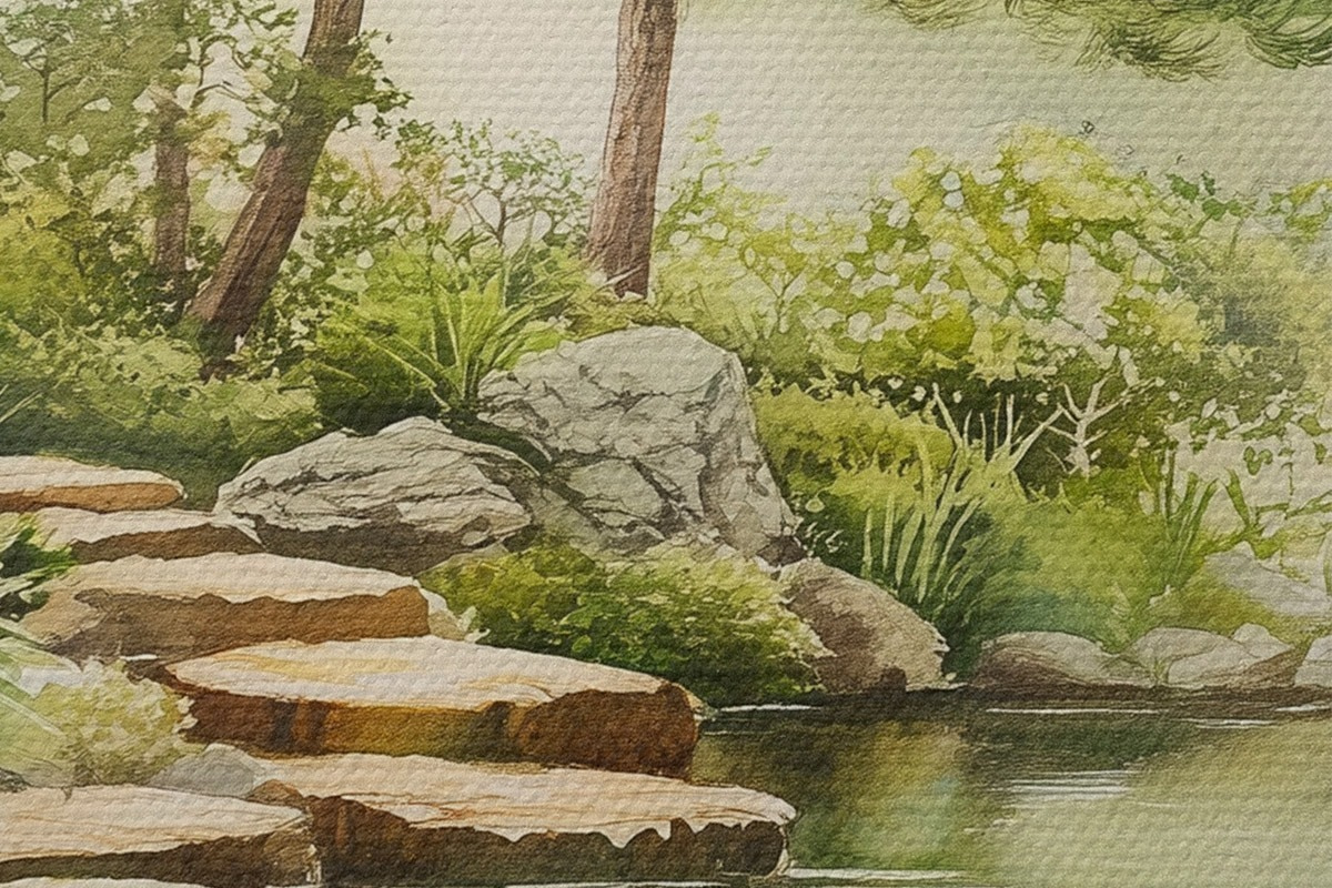 Tableaux rondes Jardin oriental avec lac et arbres, nature, style aquarelle r44313