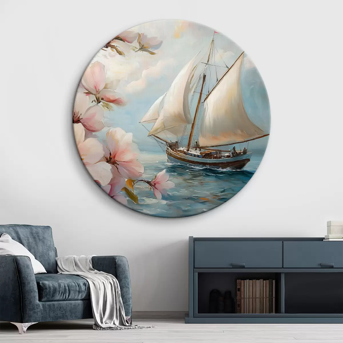 Tableaux rondes Bateau sur la mer et grandes fleurs Nr r44330
