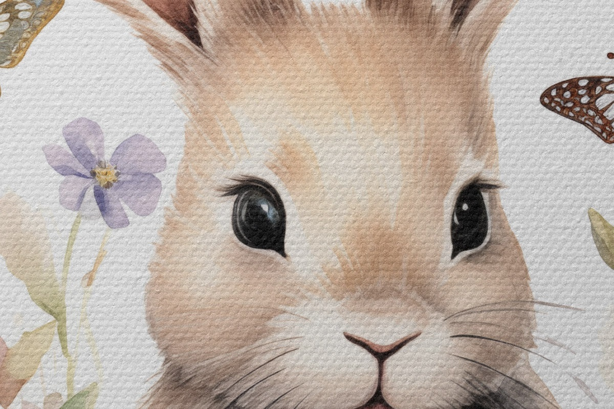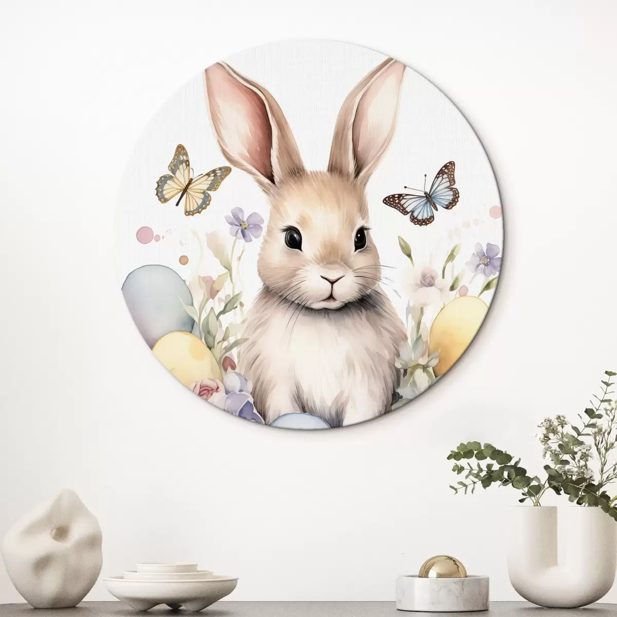 Tableaux rondes Lapin mignon en style aquarelle dans des fleurs avec des papillons r44388