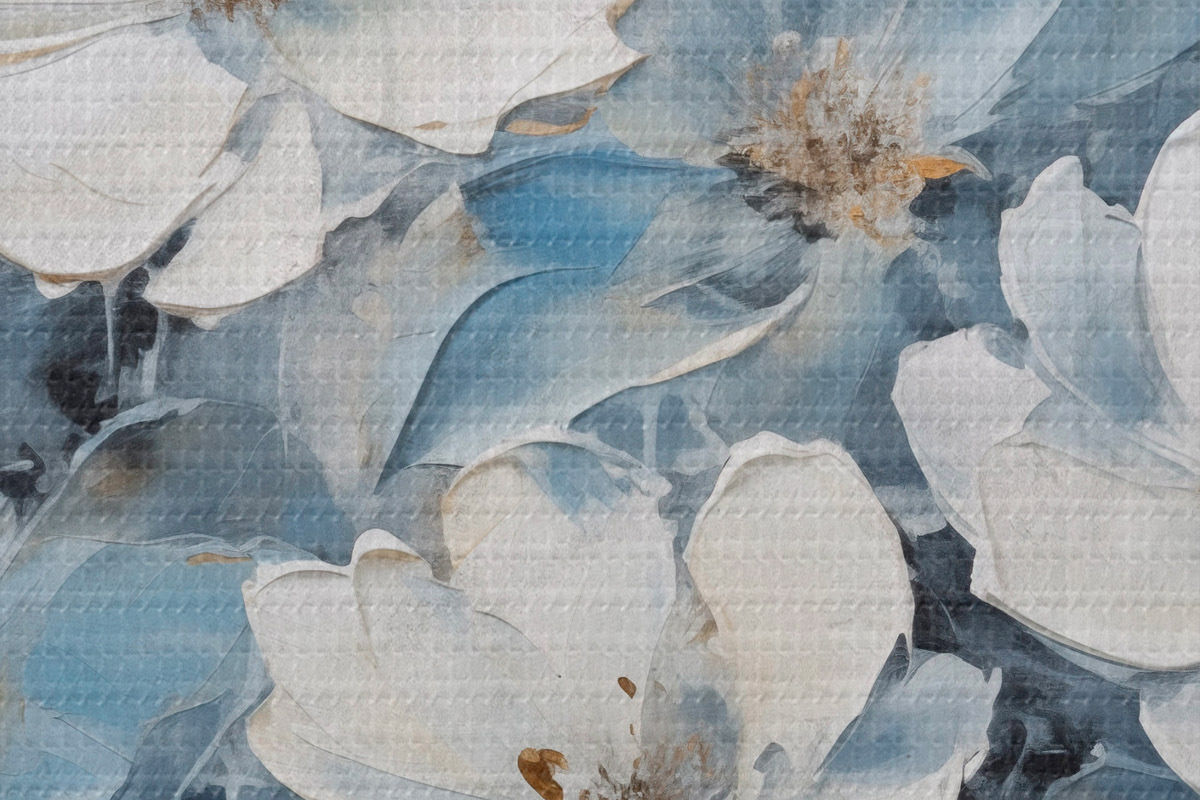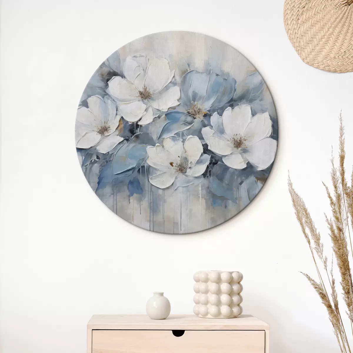 Tableaux rondes Fleurs blanches avec des feuilles bleues, sur un fond beige clair, avec des coups de pinceau visibles Nr r44395