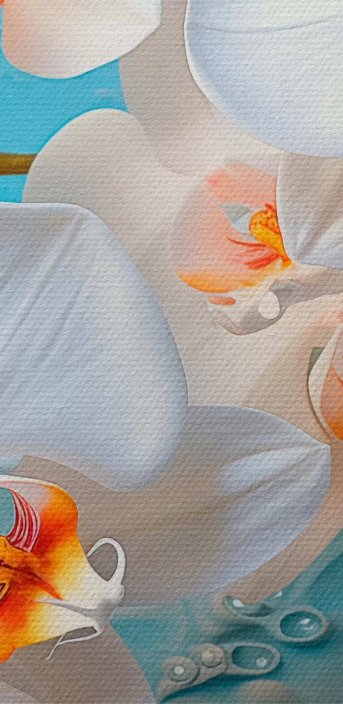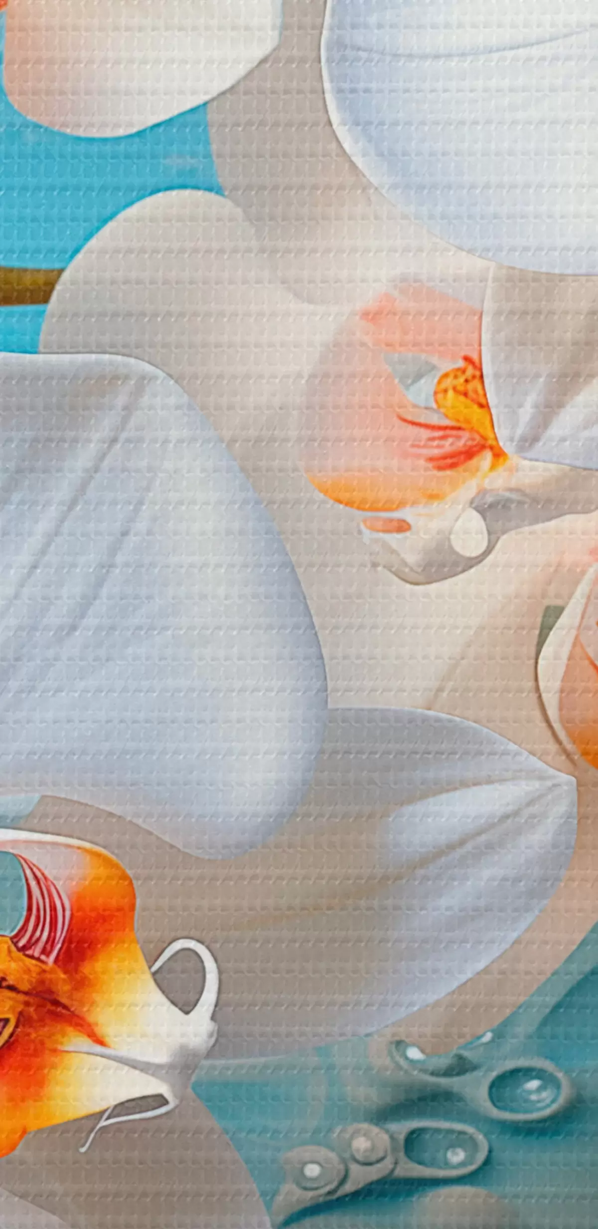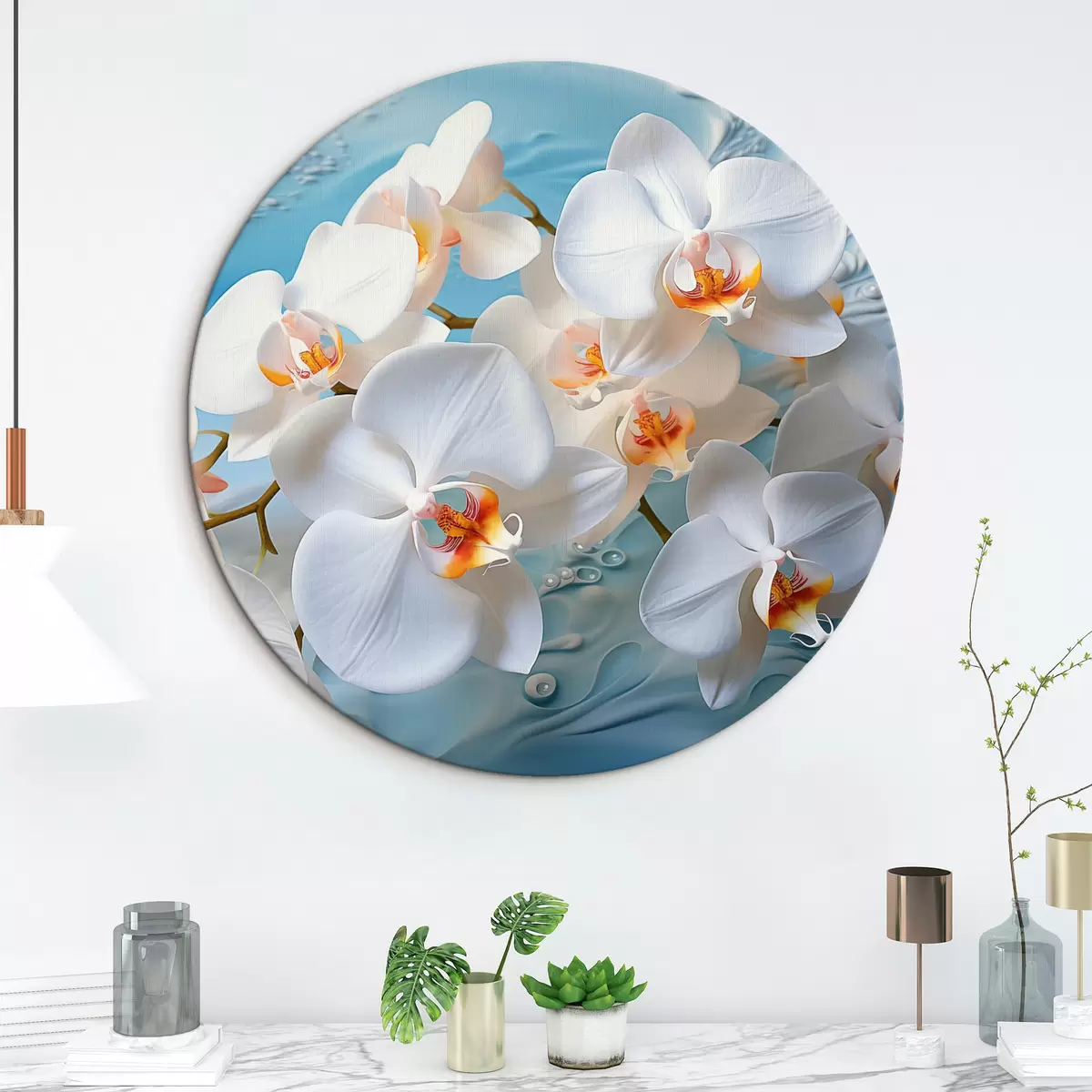 Tableaux rondes Orchidées blanches, disposées sur une surface bleu clair avec des gouttelettes d'eau, éclairage doux Nr r44401