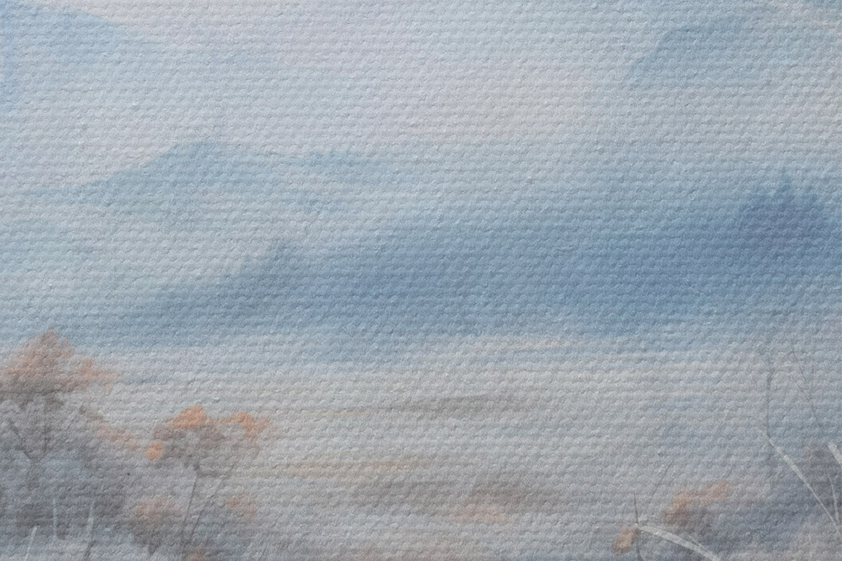 Tableaux rondes Paysage texturé avec des montagnes, de l'herbe sèche et une forêt, couleurs sourdes r44402