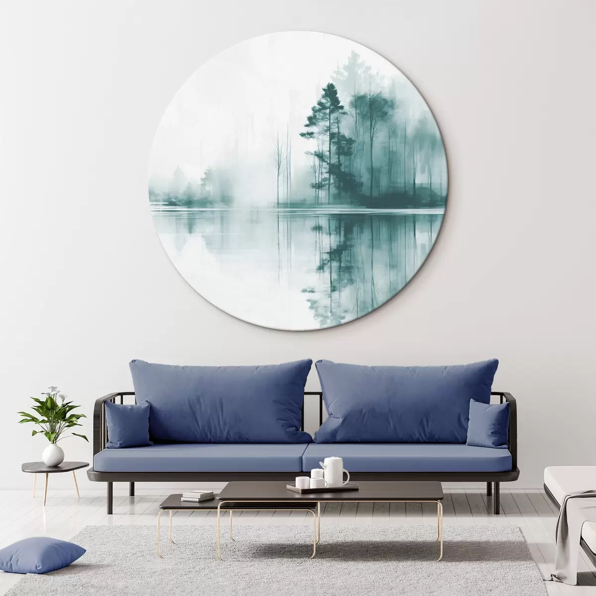 Tableaux rondes Forêt abstraite avec de grands arbres se reflétant dans l'eau, palette de couleurs sourdes Nr r44403