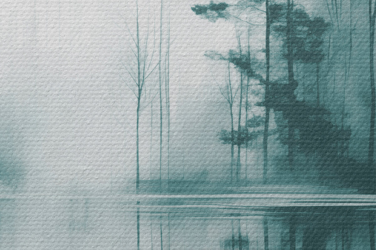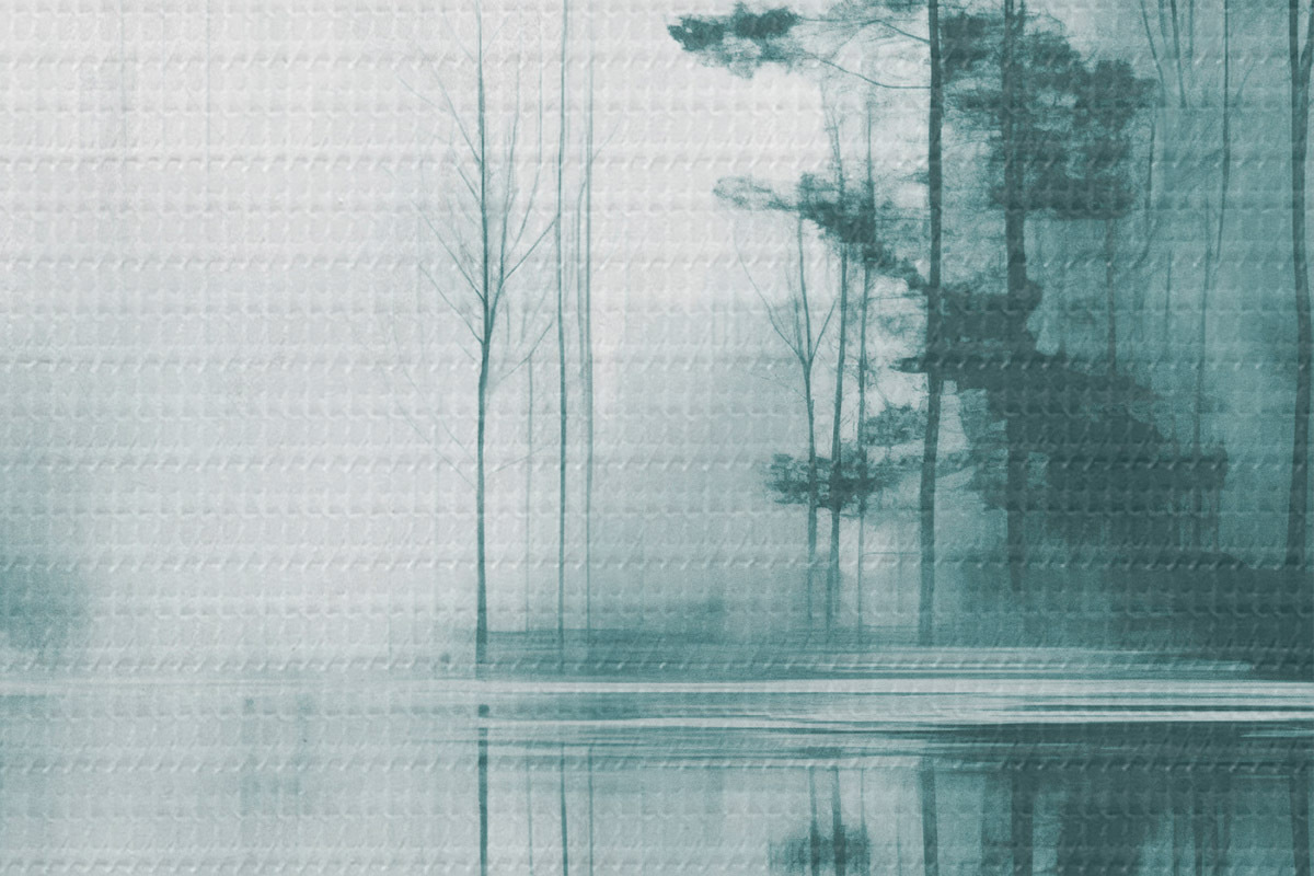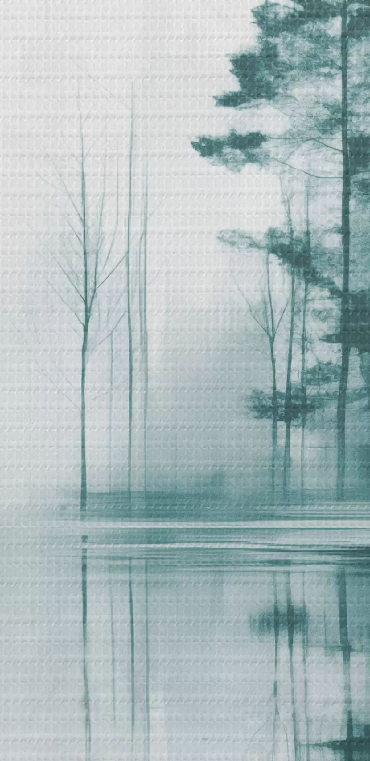 Tableaux rondes Forêt abstraite avec de grands arbres se reflétant dans l'eau, palette de couleurs sourdes r44403