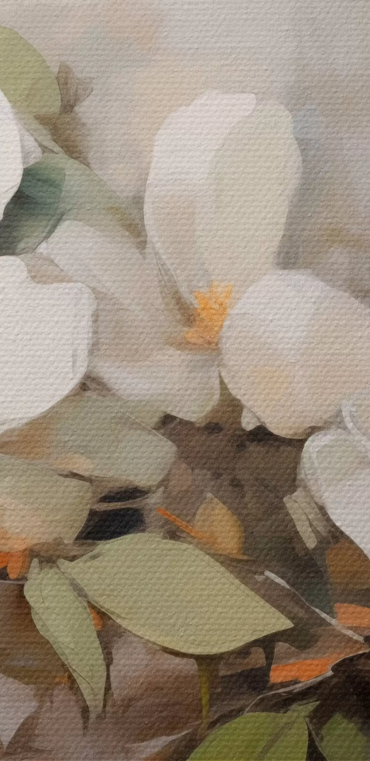 Tableaux rondes Fleurs de magnolia blanches avec feuilles vertes sur une branche, coups de pinceau doux, couleurs sourdes r44404