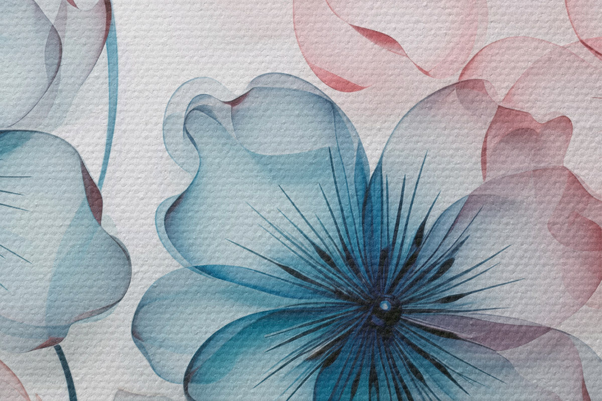 Tableaux rondes Fleurs translucides roses et bleues avec étamines et tiges visibles r44405