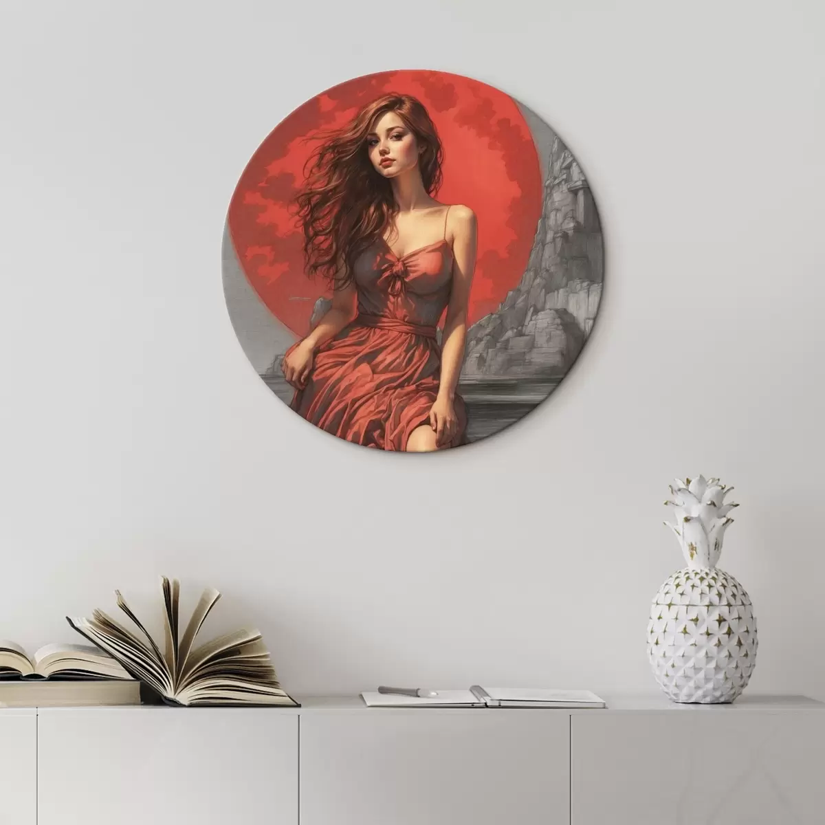 Tableaux rondes Fille sur fond de lune rouge Nr r44448
