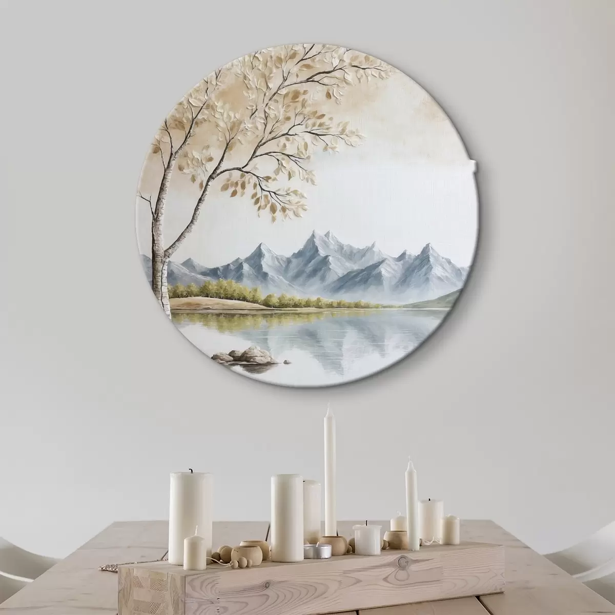 Tableaux rondes Arbre sur fond de lac et de montagnes enneigées Nr r44459
