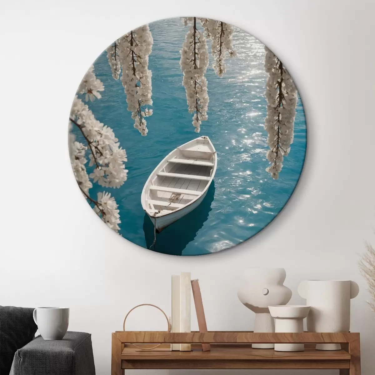 Tableaux rondes Bateau blanc sous un arbre Nr r44482