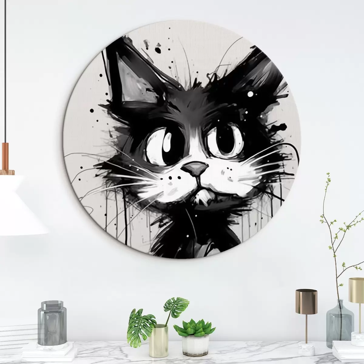 Tableaux rondes Chat en style croquis avec des éclaboussures de peinture r44483