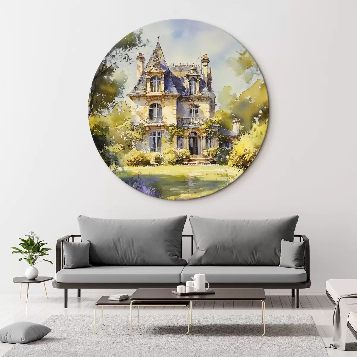 Tableaux rondes Chalet de campagne français, style aquarelle, champs de lavande r44501