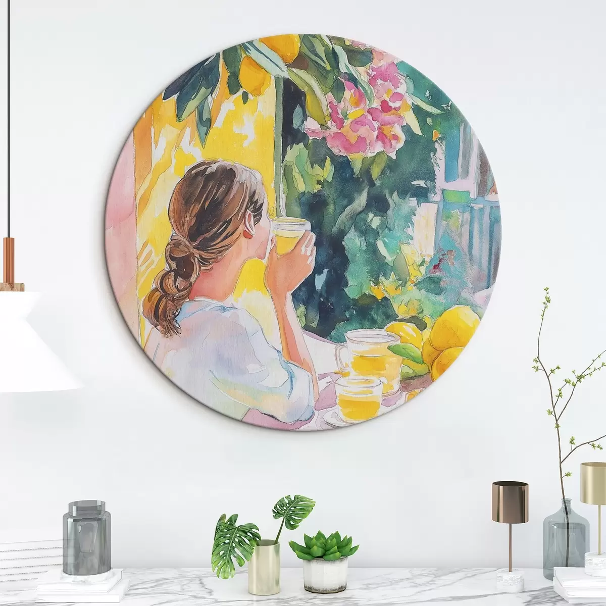 Tableaux rondes L'été, une fille dans un café, limoncello, Italie, style aquarelle Nr r44505