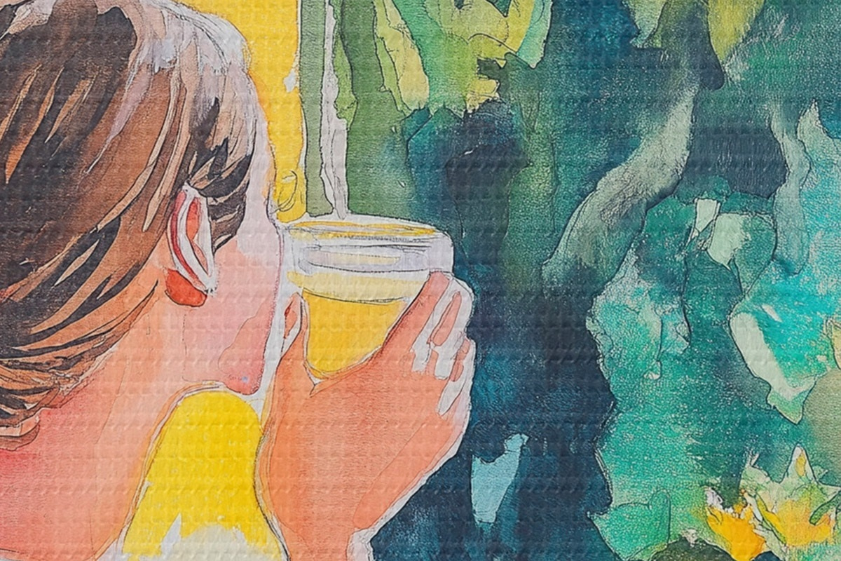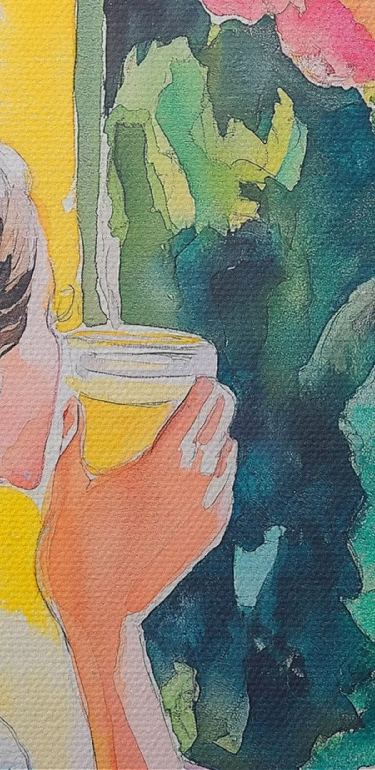 Tableaux rondes L'été, une fille dans un café, limoncello, Italie, style aquarelle r44505