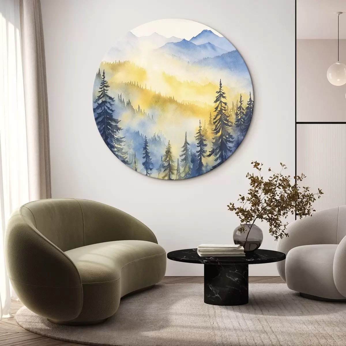 Tableaux rondes Montagnes brumeuses au lever du soleil, forêts de pins, couleurs bleues et jaunes r44602