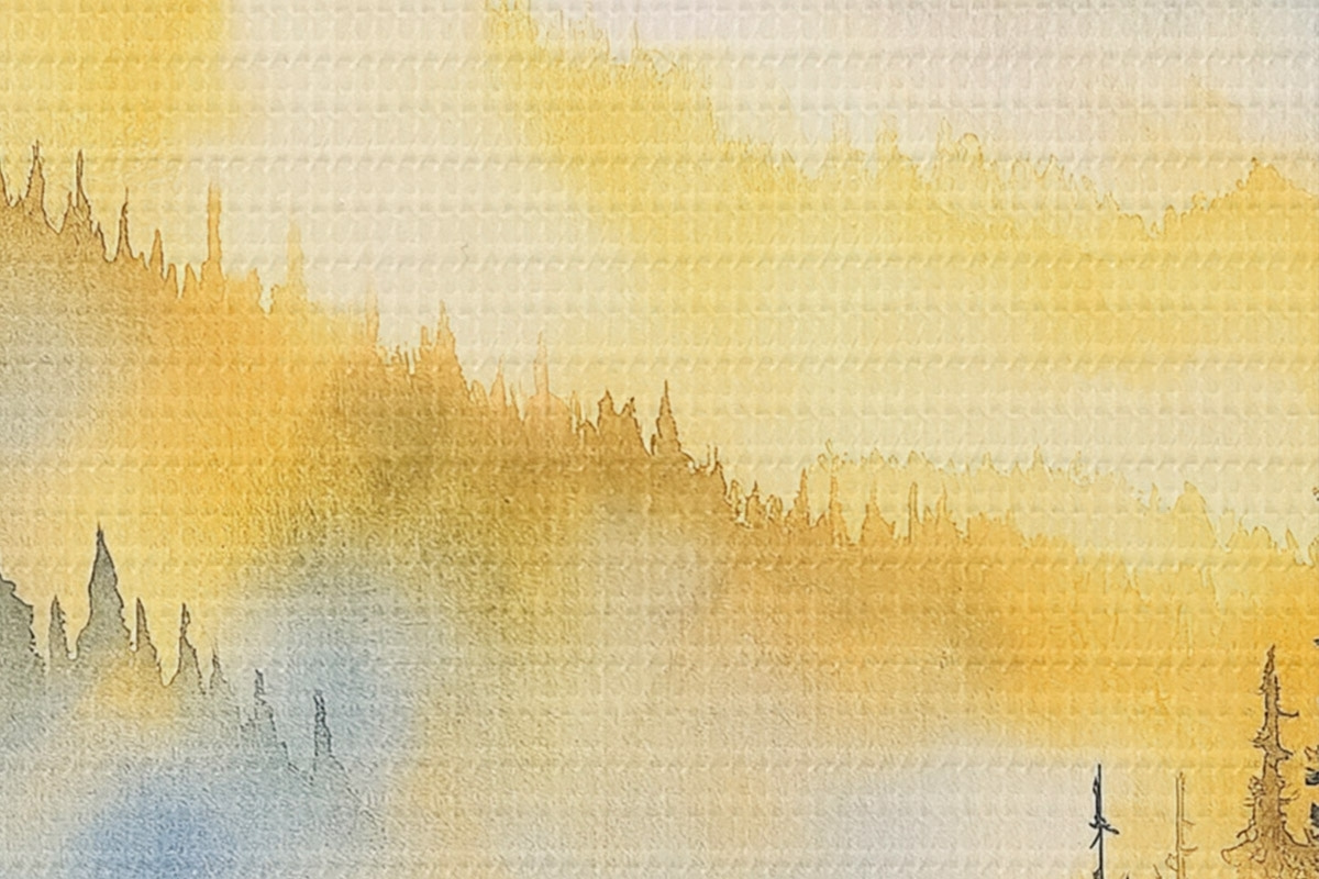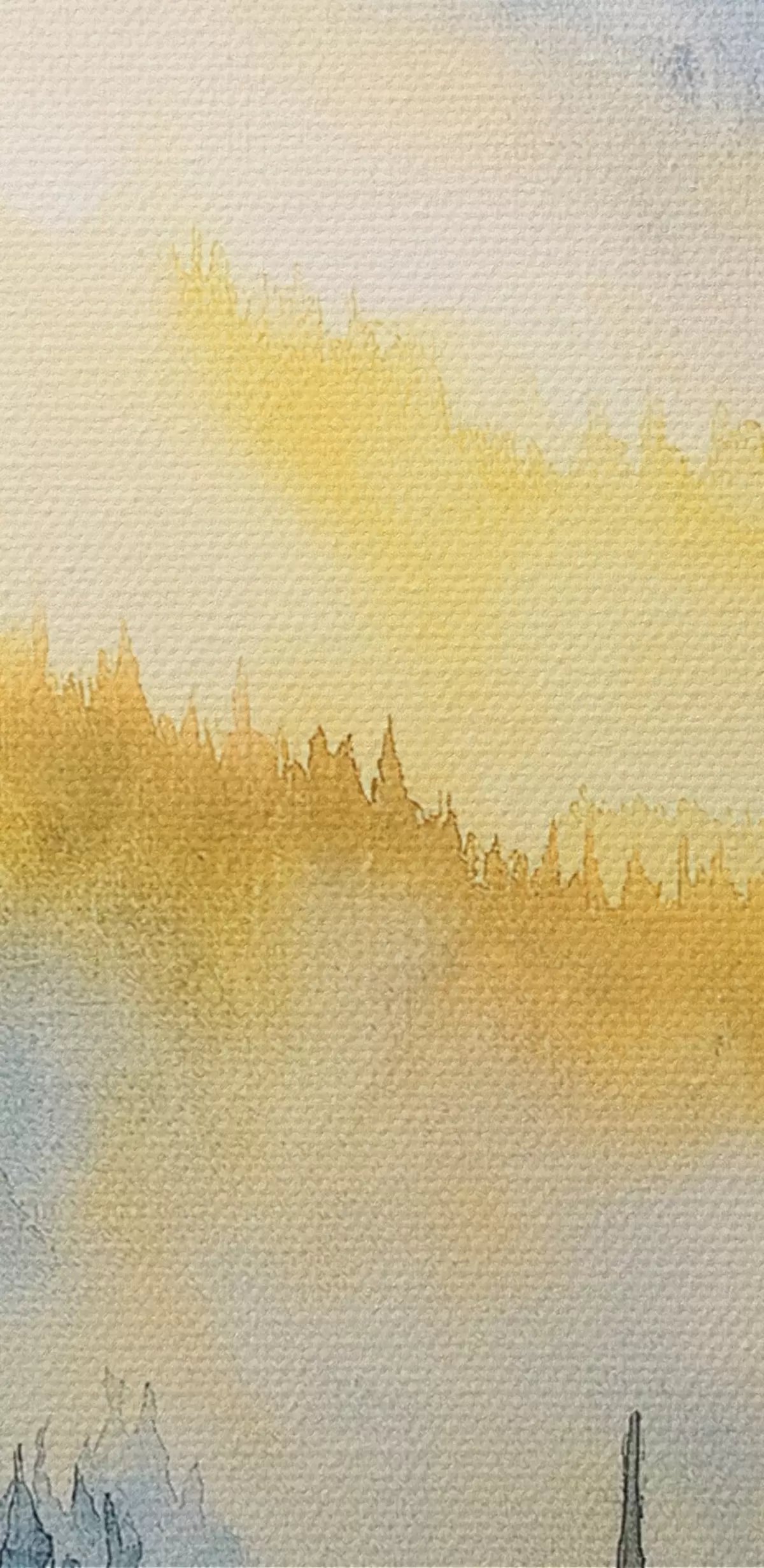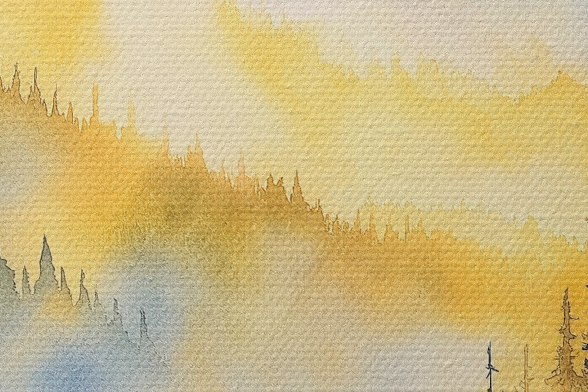 Tableaux rondes Montagnes brumeuses au lever du soleil, forêts de pins, couleurs bleues et jaunes Nr r44602