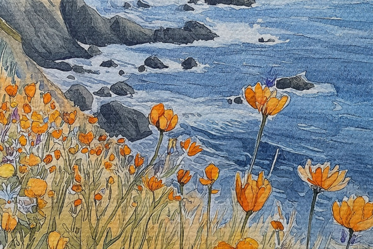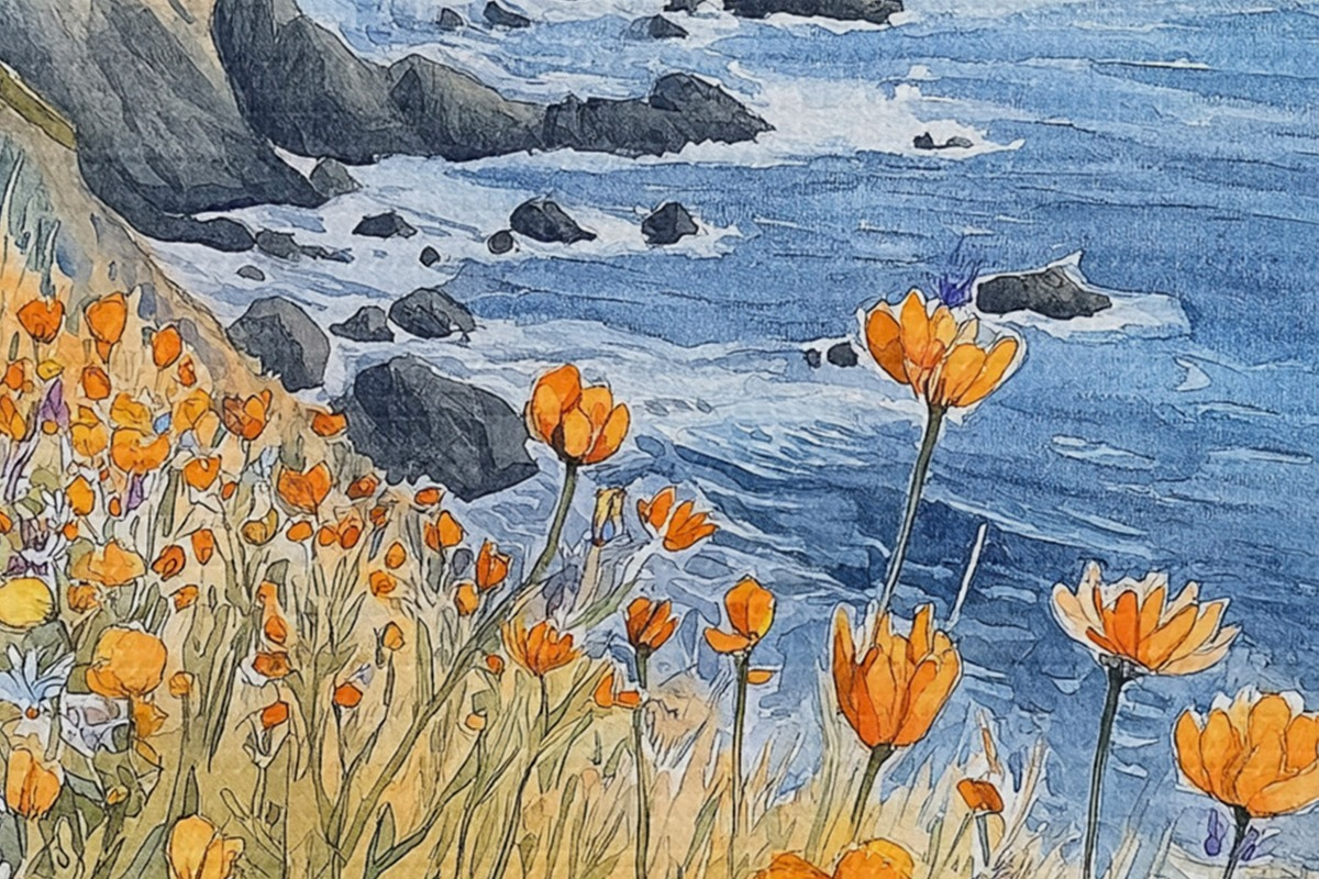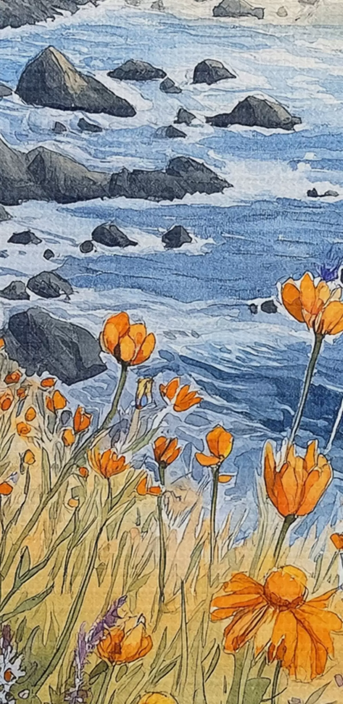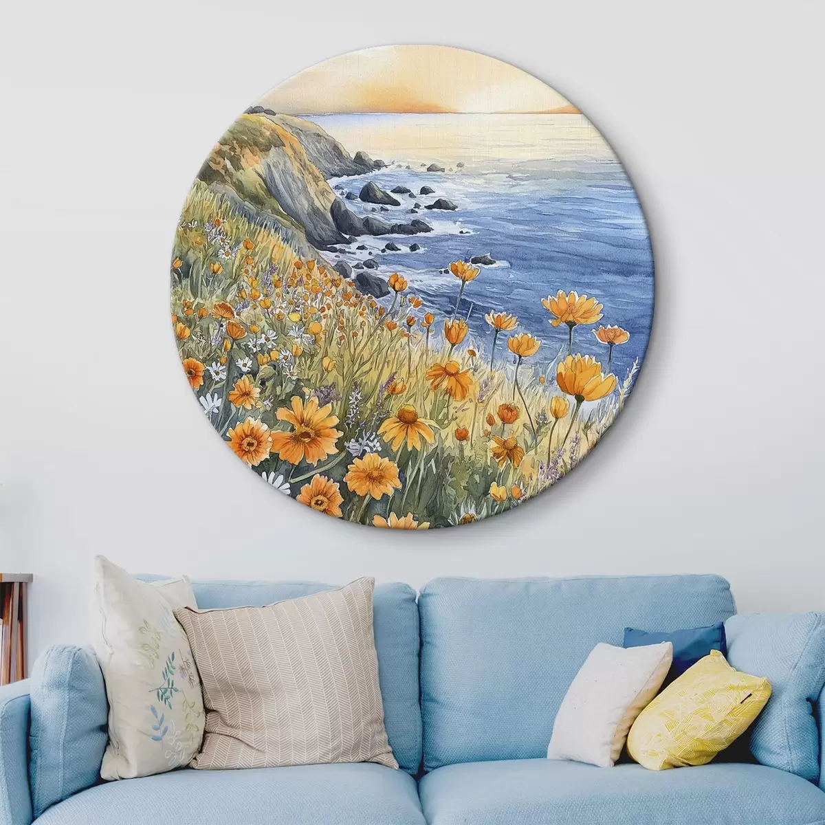 Tableaux rondes Falaise avec fleurs d'oranger, côte océanique, Portugal, style aquarelle r44604