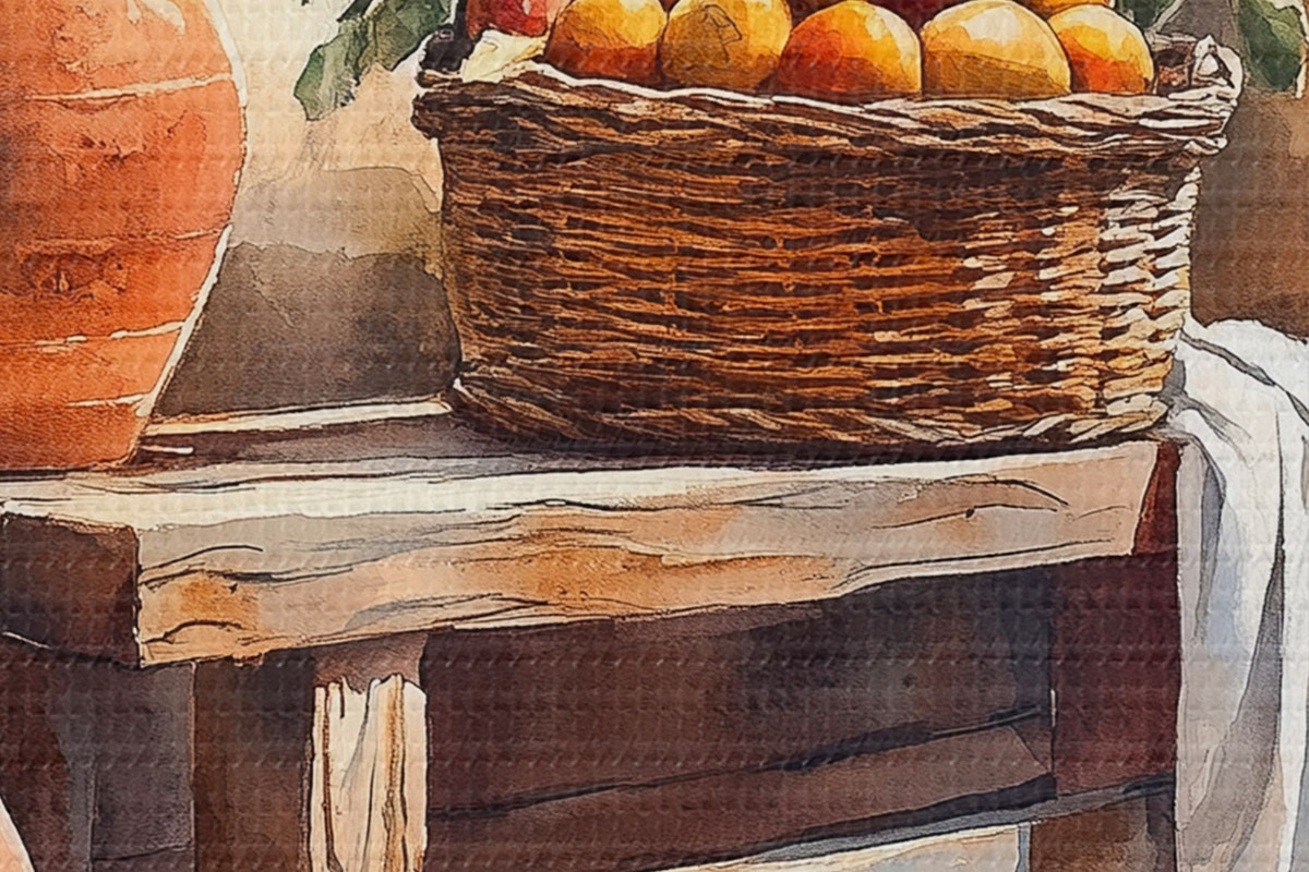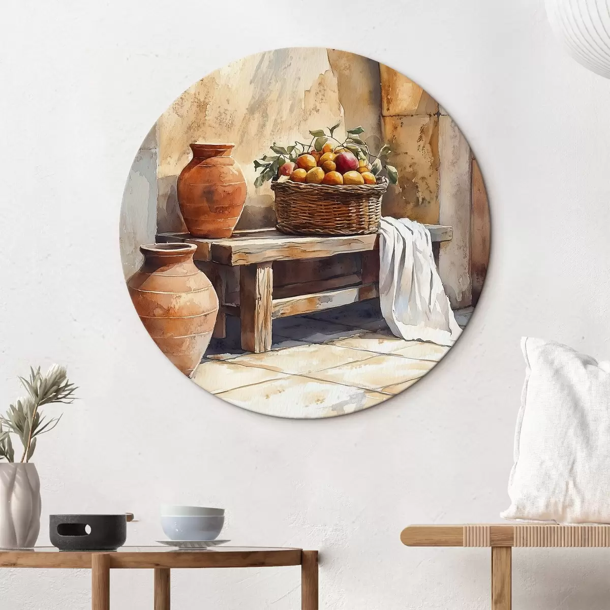 Tableaux rondes Vases esthétiques et panier en osier avec oranges, Toscane, style rustique Nr r44605