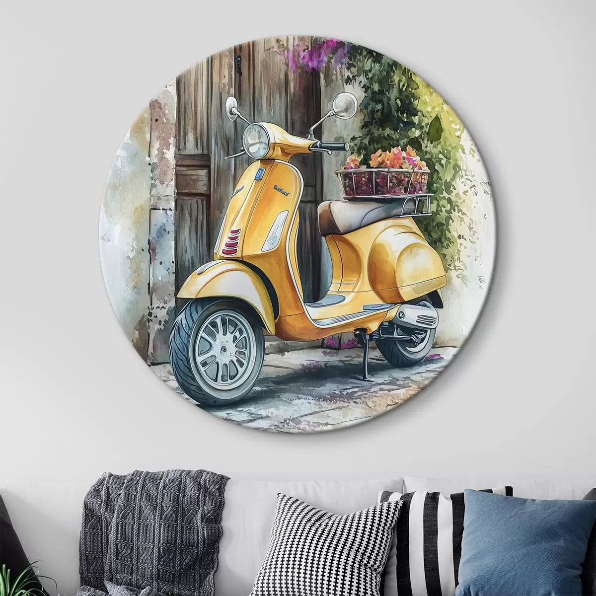 Tableaux rondes Scooter Vespa jaune près d'une porte en bois avec des fleurs Nr r44607