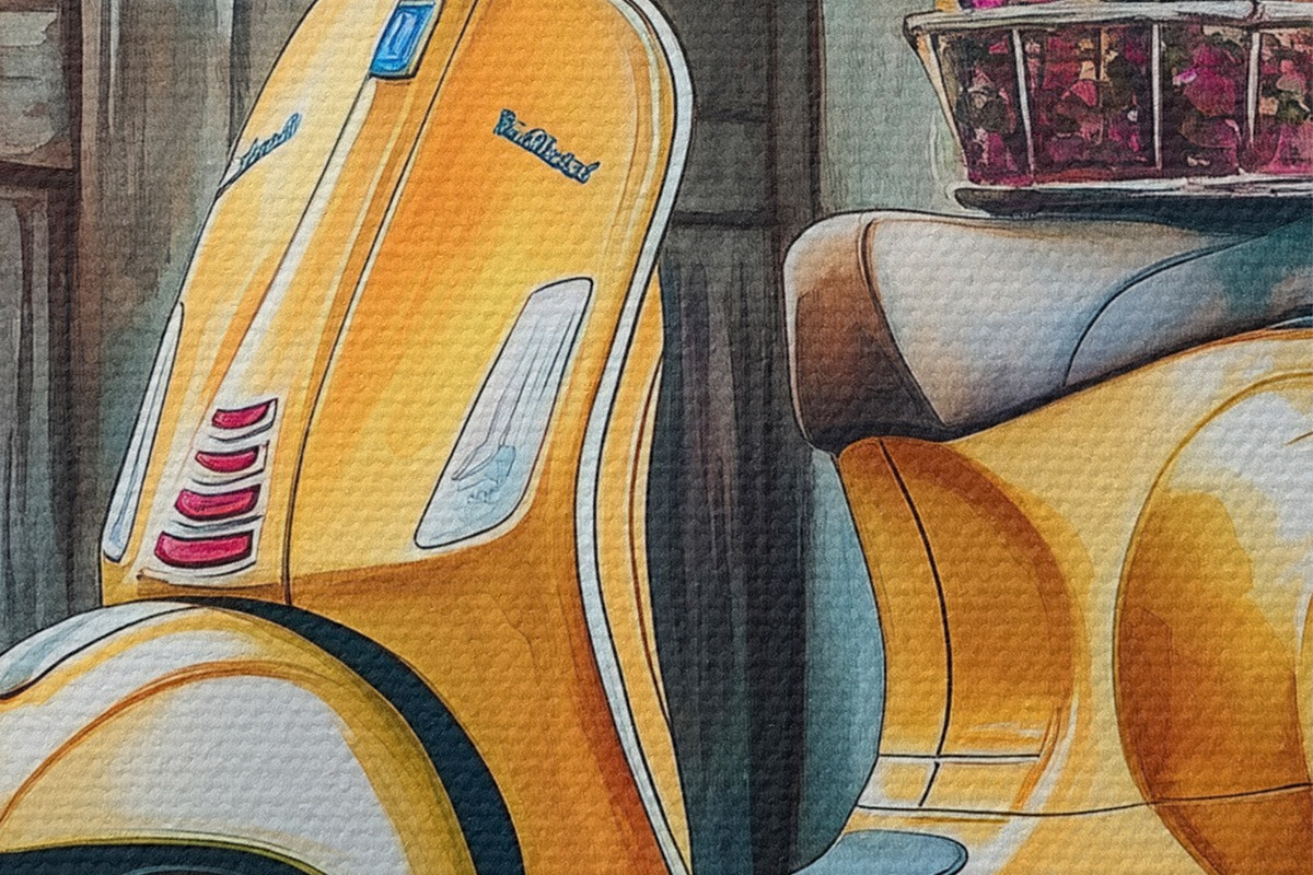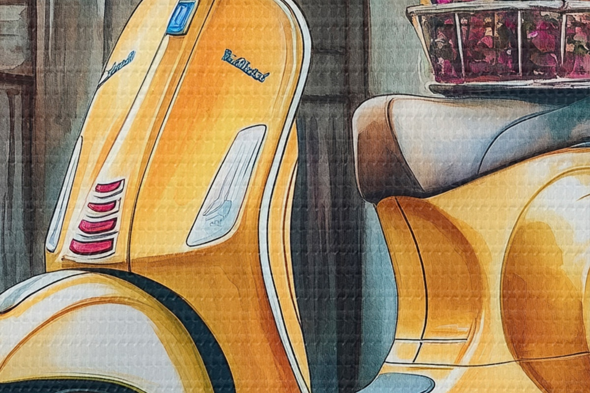 Tableaux rondes Scooter Vespa jaune près d'une porte en bois avec des fleurs r44607