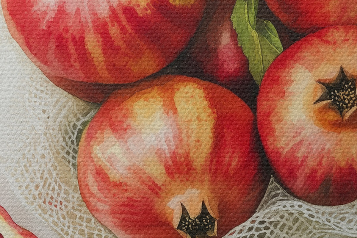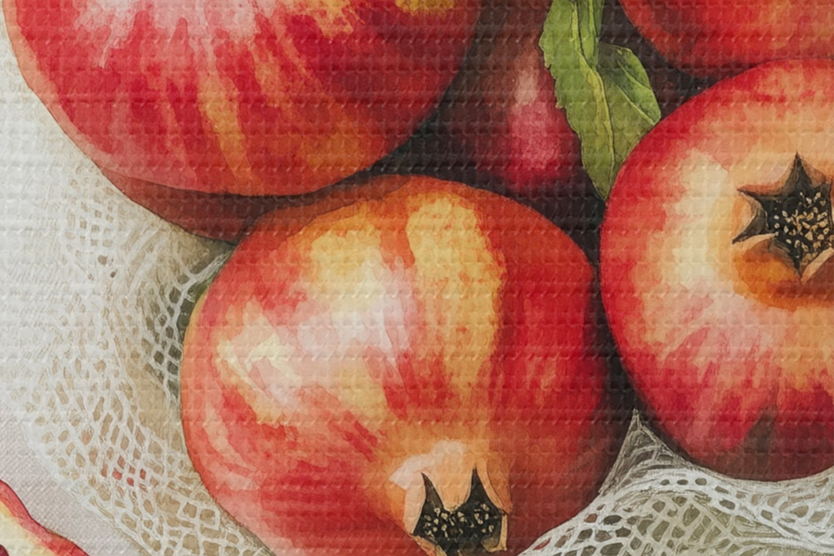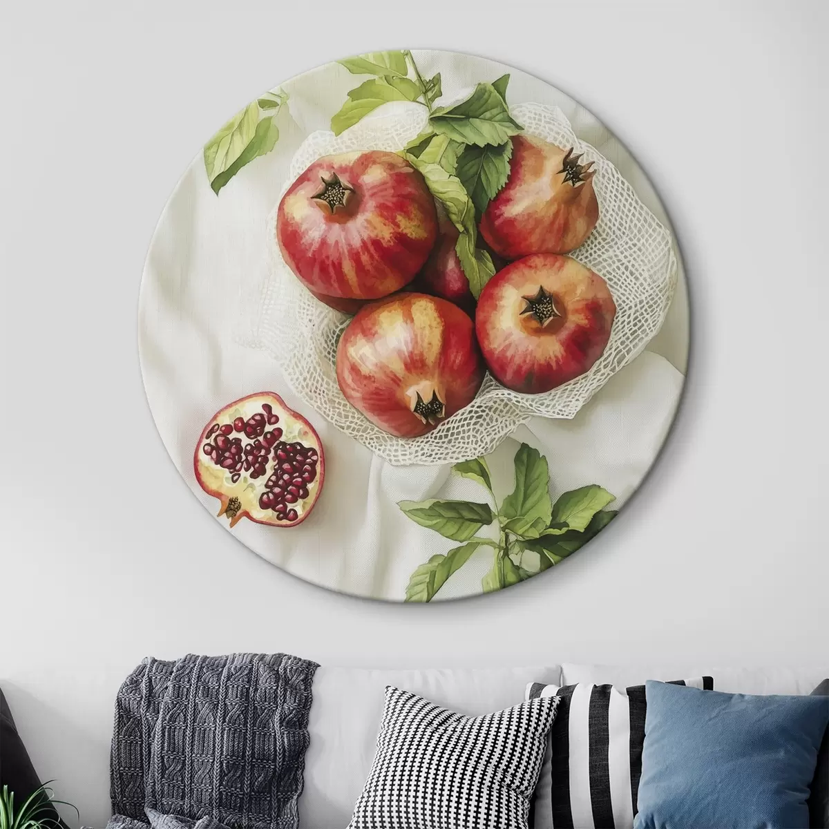 Tableaux rondes Grenades avec feuilles de menthe sur les nappes en lin, style rustique Nr r44611